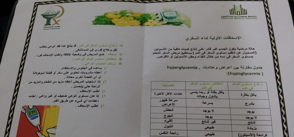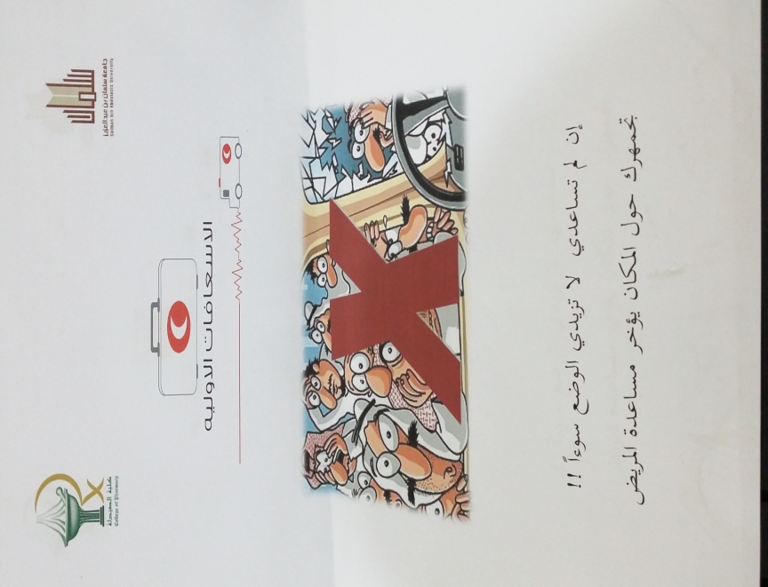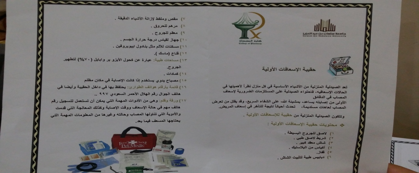 ضمن فعاليات الأنشطة الطلابية بكلية الصيدلة بأقسام الطالبات تم تنفيذ برنامج (الإسعافات الأولية ) تحت اشراف مساعدة العميد لشطر الطالبات ومقررة لجنة الانشطة الطلابية بالكلية الاستاذة الدكتورة اماني عواد وذلك يوم الاثنين الموافق 16\2\1436ه حيث هدف هذا البرنامج الى التذكير بضرورة توفر مهارات المسعف لكل شخص وأنها لا تقتصر على المختصين بالمجال الصحي فقط , وتم التعريف بأهم مكونات حقيبة الإسعافات الأولية وطرق استخدامها بالإضافة الى توزيع مطويات تتضمن أهم الحوادث وطرق التعامل معها كالإنعاش القلبي الرئوي والتشنجات والحمى والحروق والتسمم , ووضعت لافتات تعريفية بمفهوم الإسعافات الأولية ولافتات أخرى تحذر من خطورة التجمهر حول المرضى وأن هذا الفعل قد يسبب عواقب وخيمة , و تم قياس ضغط الدم لمجموعة من الطالبات والتنويه حول الضغط الطبيعي للطالبات في هذا العمر , ولقد كان لهذا البرنامج الأثر الكبير في نفوس الطالبات والحضور من خلال زيادة الوعي والتثقيف الصحي ،يذكر ان الطالبات المشتركات في النشاط هن: أثير غزاي الحربي - أسماء عبيد العتيبي- أمل أحمد صفحي- أميرة سلمان المعيذر- روان عبدالله التميمي - منال صالح العرفج- نورة عبد العزيز التميمي