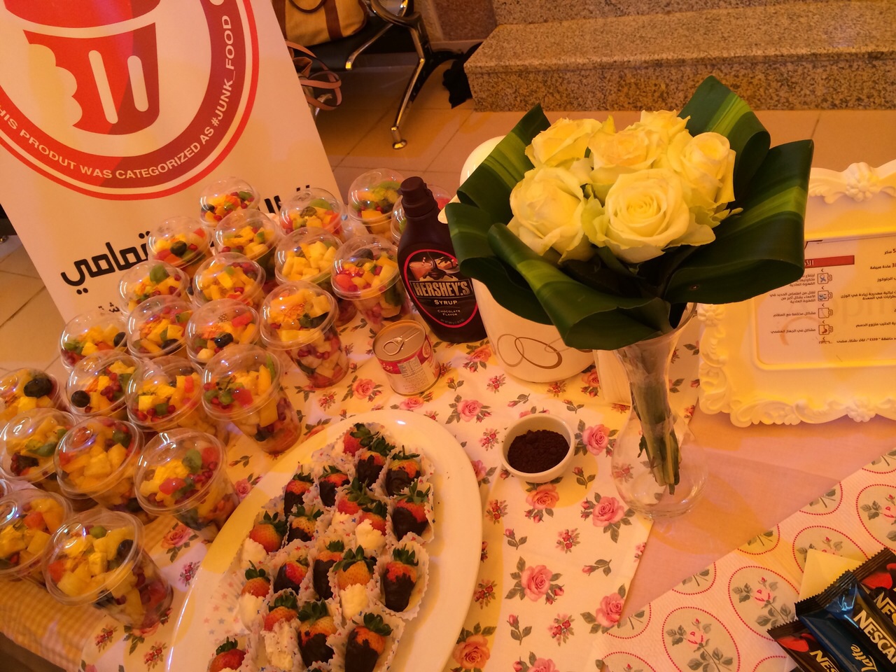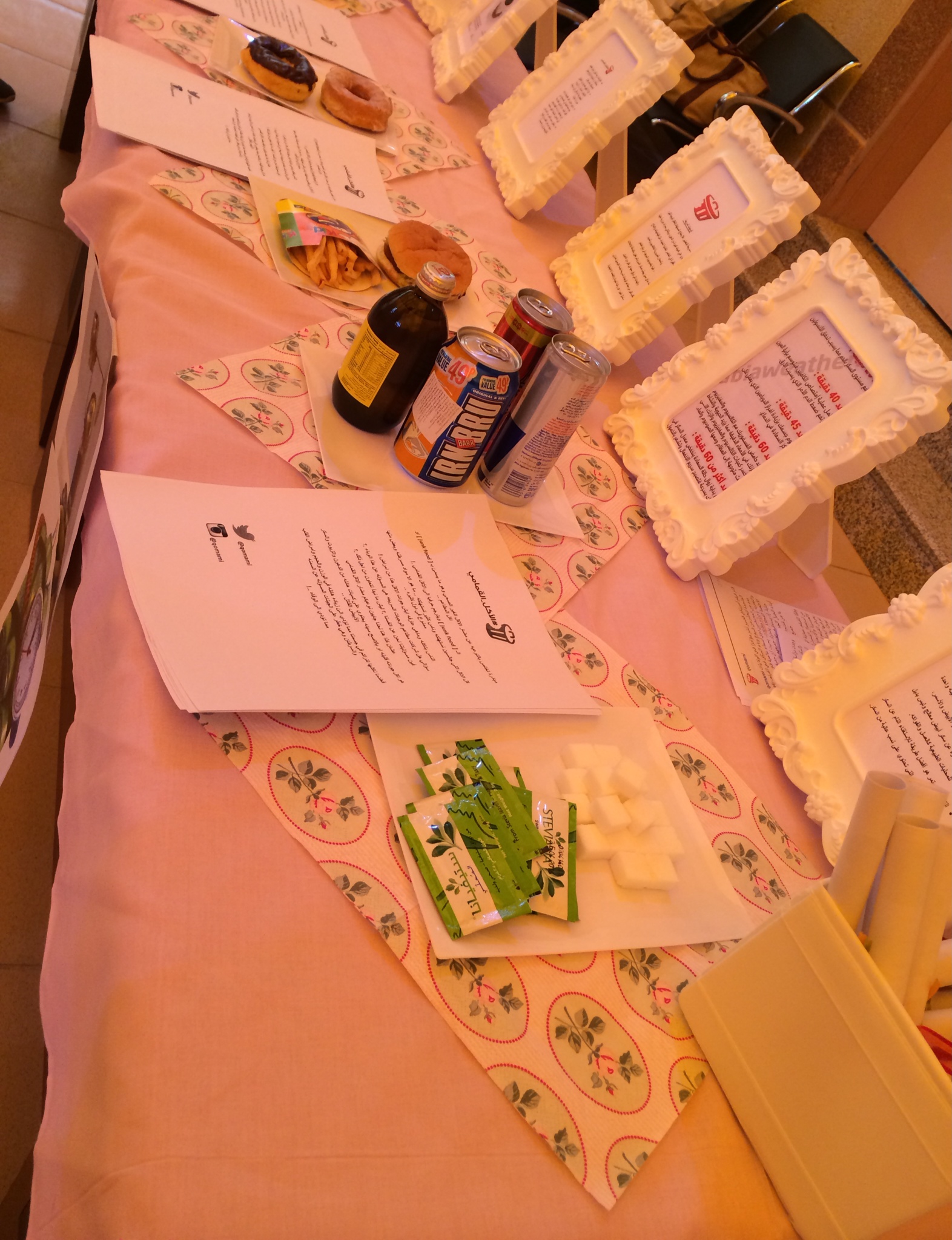 كما صاحب البرنامج اركان اشتملت على نشرات توعوية و عينات لأغذية صحية واخرى غير صحية والفرق بينهما بالاضافة الى ارشادات لكيفية اختيار أطعمه صحية يذكران الطالبات المنظمات للنشاط هن كل من : نوره الصويغ ، مريم الحراجين ، تهاني العتيبي ، نوره الخضران ، نوف ال سالم أثير الجعيدي، مريم الغامدي