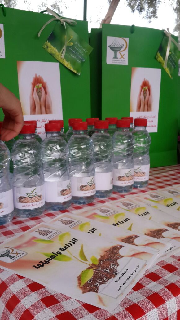 في منتزه المشتل بالخرج وتضمن النشاط لافتات تعريفية بفائدة الزراعة ومطويات جذابة من تصميم الطالبات توضح فضل عمارة الأرض و أهمية الزراعة في الإسلام وفوائدها ومجالاتها وأيضاً احتوى على هدايا للأطفال تشجعهم على الزراعة (حراثة وفأس ) وألعاب تلوين عن الشجر لغرس حب الزراعة في الأطفال بالاضافة إلى توزيع بعض الشتلات والورود للأطفال والمتنزهين بالمشتل ‘ يذكر ان الطالبات المنظمات للنشاط هن :
