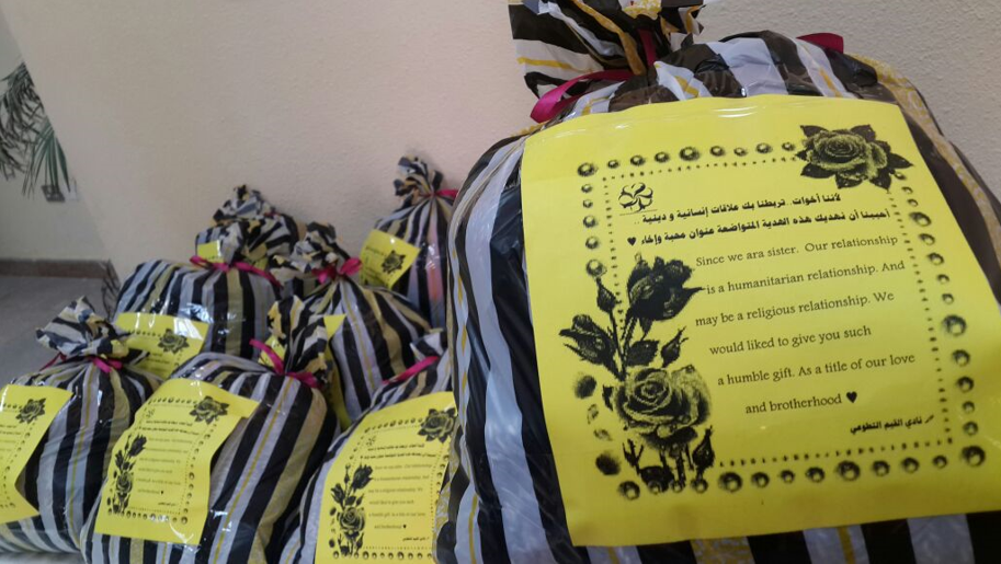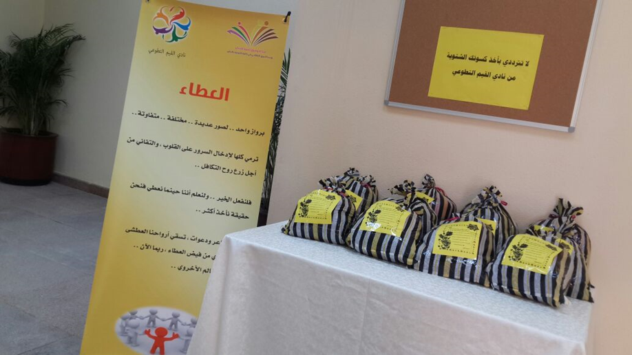 وقد قامت عضوات نادي القيم التطوعي وبمساعدة عدد من طالبات قسم الاقتصاد المنزلي ، بجمع كسوة شتاء ، والتي تحتوي على ( بلوفر شتوي – قفاز – جوارب – شال- غطاء للرأس ) حيث تم تنسيقها بشكل جميل وتوزيعها على عاملات النظافة والمراسلات بالكلية ، وما فاض من الكمية ترك لمن تحتاجه من الطالبات .