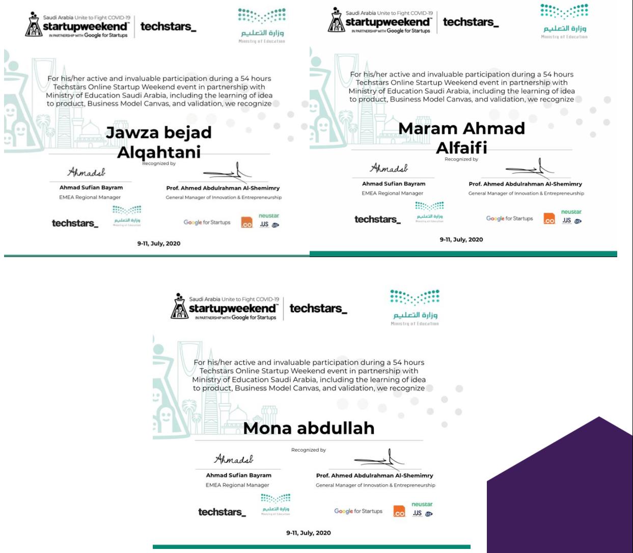إمتداداً لتوالي الإنجازات فقد حقق فريق عين يمامة الذكية والذي تنتمي له الطالبة بكلية هندسة وعلوم الحاسب "شطر الطالبات" مرام أحمد يحيى الفيفي (قسم علوم الحاسب) الفوز بالمراكز العشر الأولى خلال مشاركتهم في فعالية ستارت اب ويكند لإبتكار الأفكار لمواجهة التحديات التي تخلقها أزمة كوفيد 19 ضمن 100 فكرة مشاركة والتحصل على الجائزة التقديرية بمبلغ 5000$ مقدمة من وزارة التعليم , كما تحصلوا كلاً من طالبات كلية هندسة وعلوم الحاسب الأخريات خلال مشاركتهم في فعالية ستارت اب ويكند وهم جوزاء بجاد شافي القحطاني ومنى عبدالله محمد الدوسري وإيمان سعيد محمد القحطاني (قسم علوم الحاسب) على جوائز وشهادات تقديرية نظراً لمشاركتهم وإجتهادهم في طرح الأفكار.