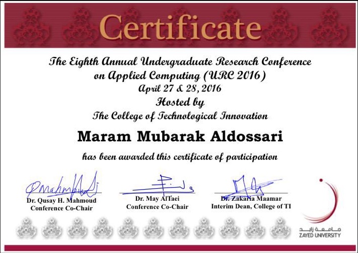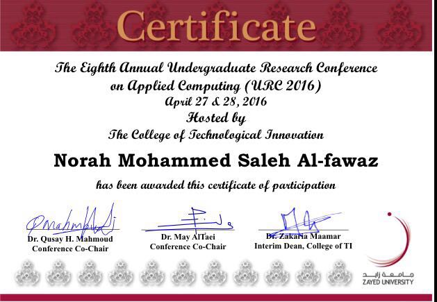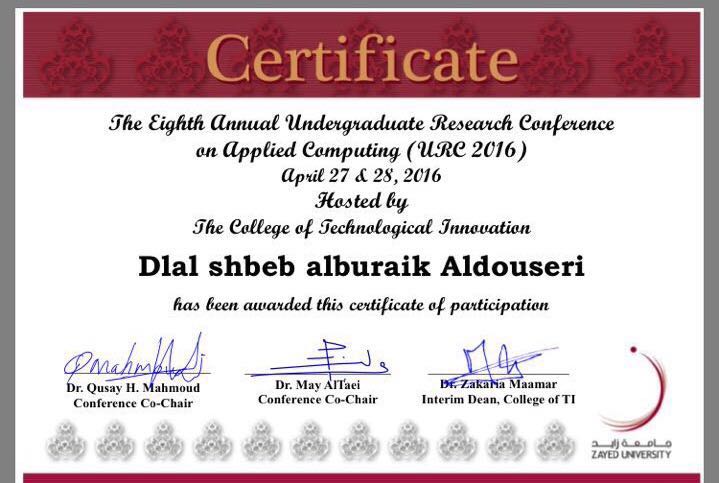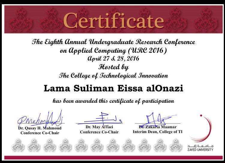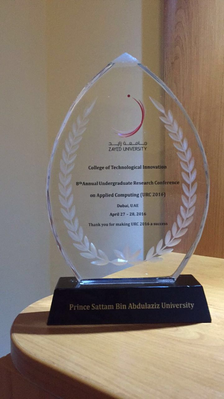 تم قبول مشاركات الطالبات لمى سليمان العنزي، دلال شبيب الدوسري، رفعة معجب الدوسري، نوره محمد الفواز ومرام مبارك الدوسري بمشروع بحثي بعنوان "IN TEGRATED RECORED MEDICAL SYSTEM" وقد حازوا من خلاله على درع وشهادات مشاركة وتمثيل لجامعة الأمير سطام بن عبد العزيز.
