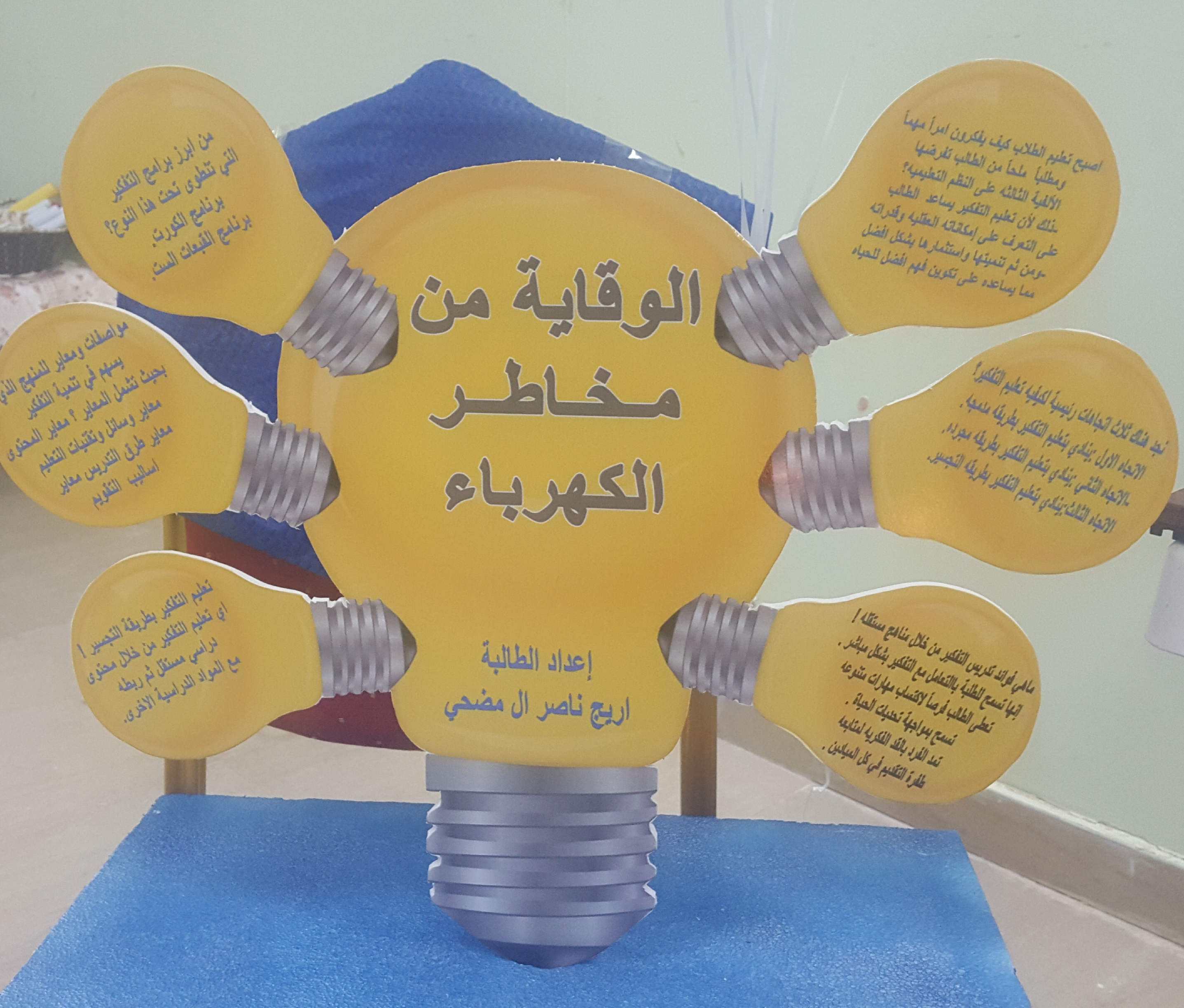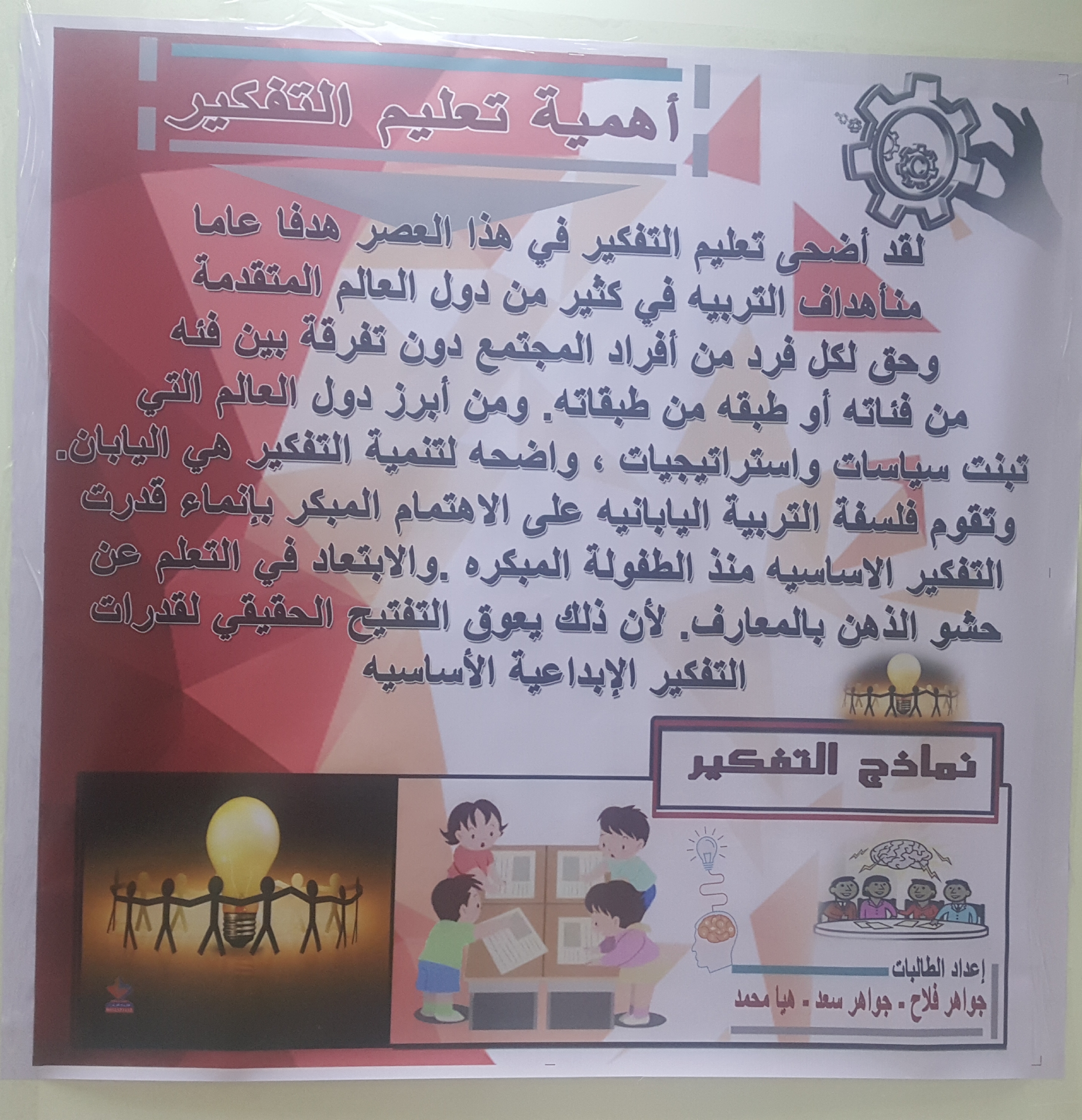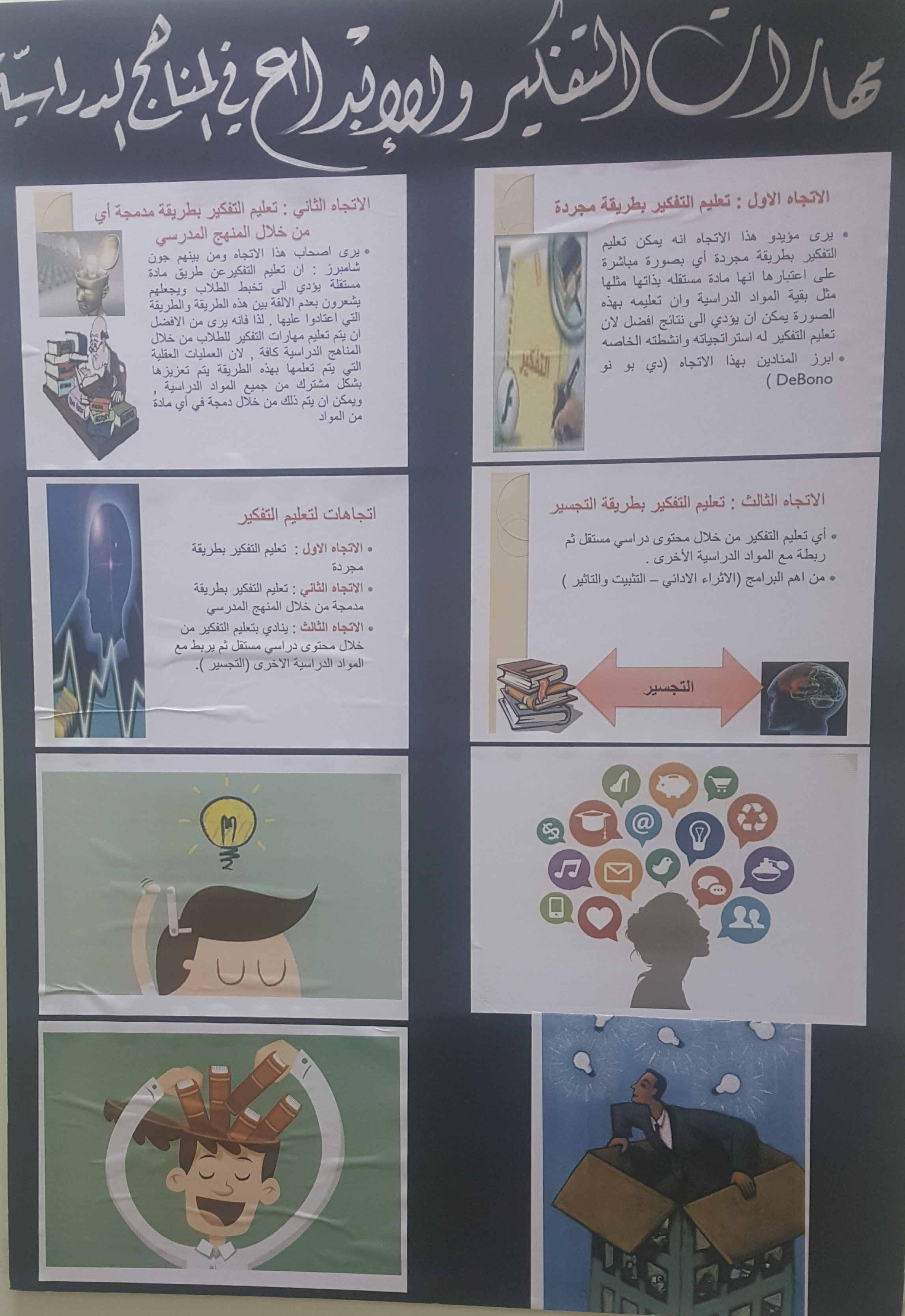 احتوى النشاط على عرض لمحتويات المقرر من خلال بعض اللوحات التوضيحية والتي اشتملت على عدة موضوعات مثل أهمية تعليم التفكير ، التفكير في التربية الإسلامية، مهارات التفكير التي وجه إليها القرآن الكريم ،تعليم التفكير من خلال المناهج الدراسية ، أنواع التفكير ، برامج تعليم التفكير مثل برنامج القبعات الست ، كما اشتمل العرض على تصميمات من عمل الطالبات تتناسب مع الموضوعات ، وأيضاُ نماذج إبداعية توضح قدرة الطالبات على التنفيذ العملي للمطلوب ،كما قامت الطالبات في نهاية النشاط بتوزيع مطويات تحتوى على ما تم عرضه .