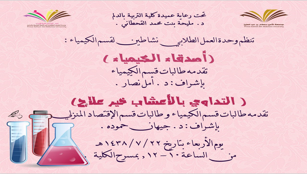 نظمت طالبات قسم الكيمياء بالتعاون مع وحدة العمل الطلابي عدد من الأنشطة والبرامج الخاصة بالقسم تحت إشراف د.أمل نصار رئيسة قسم الكيمياء ود. جيهان حمودة ، يوم الأربعاء الموافق 22/7/1438هـ من الساعة 9 صباحاً حتى الساعة 12 ظهراً على مسرح الكلية .