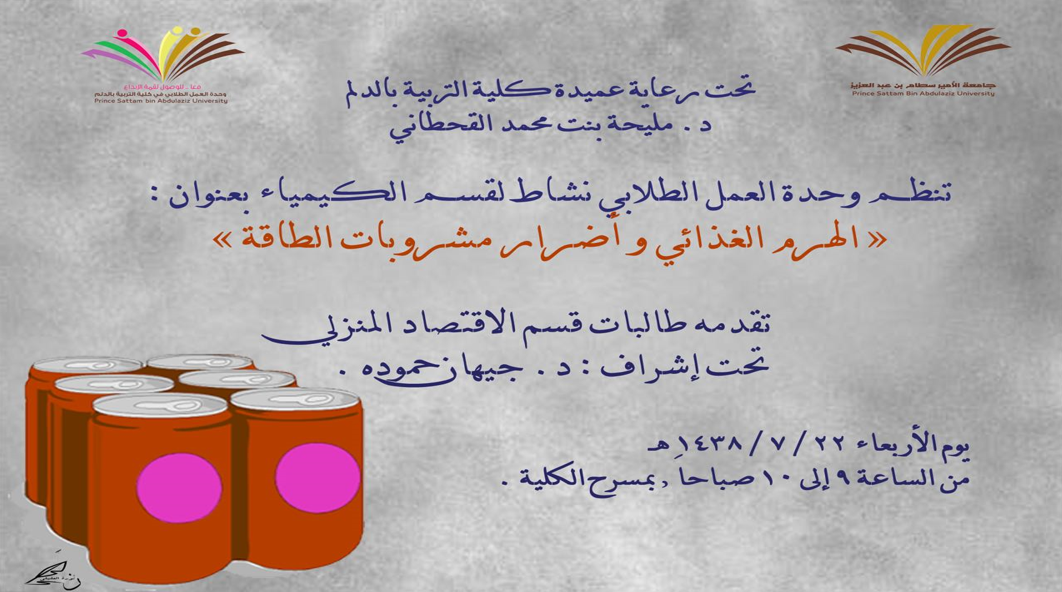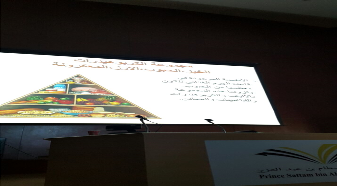 الفئة المستهدفة الطالبات والهيئة التعليمية والإدارية ، وقد اشتملت الأنشطة على ثلاثة برامج مهمة في حياتنا، وهي بـرنامج (الهرم الغذائي وأضرار مشروبات الطاقة) ، والذي يهدف إلى الدعوة إلى التغذية الصحية - التعريف بالهرم الغذائي الصحي وأضرار مشروبات الطاقة .