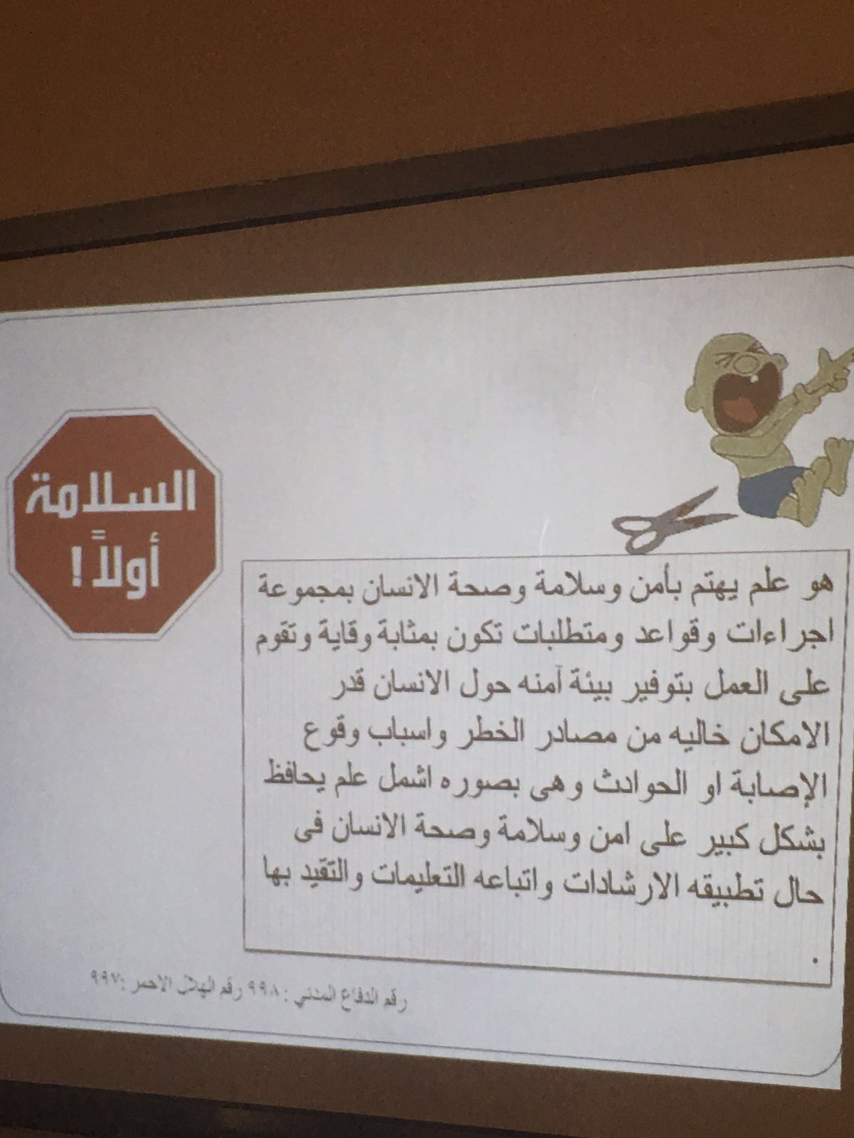 نظم قسم الكيمياء بالتعاون مع كلاً من / طالبات المجالس الطلابية - طالبات التربية الميدانية برنامجاً بعنوان " قواعد الآمن والسلامة بالمؤسسات التعليمية والمنازل " بمناسبة اليوم العالمي للدفاع المدني يومي الثلاثاء و الأربعاء الموافق من 21 إلى 1437/5/22هـ تحت إشراف / أ.فاتن منصور عضو هيئة التدريس بقسم الكيمياء ،و طالبات المجالس الطلابية / المها الودعاني ، فاطمة الزبيدي , شيخة الذياب , ليلى عبده ، حنان الشهري ، رحاب العويدان وطالبات التربية الميدانية قسم الكيمياء ،و تم الاستعانة بممرضات من مستشفي الأمير سلمان بالدلم في البرنامج الذي أقيم يوم الثلاثاء بالثانوية الخامسة بالدلم ،كما تم تفعيل البرنامج يوم الأربعاء بالكلية بقاعة الخنساء الساعة الثامنة صباحاً .