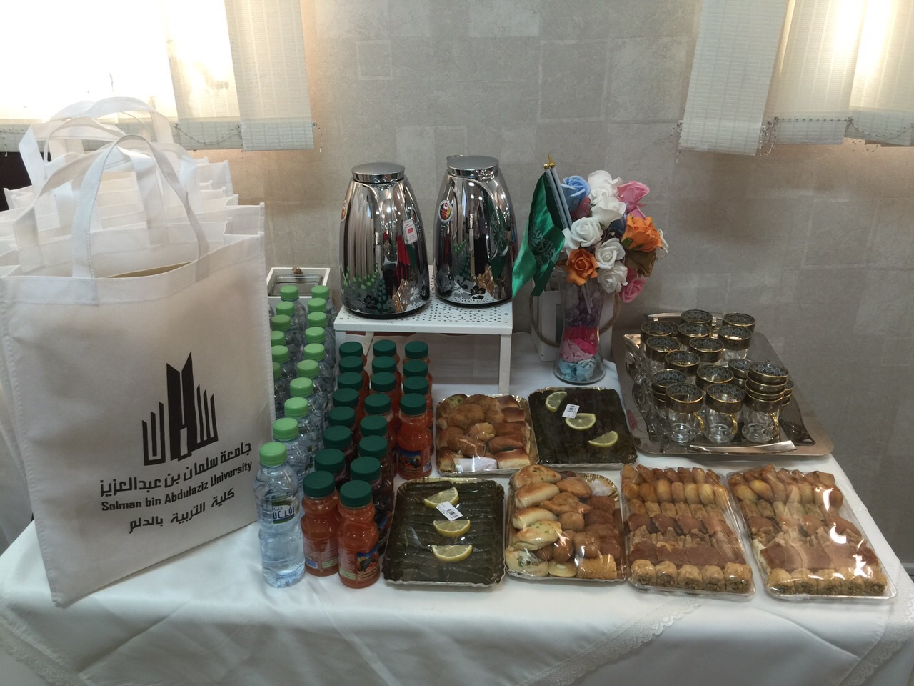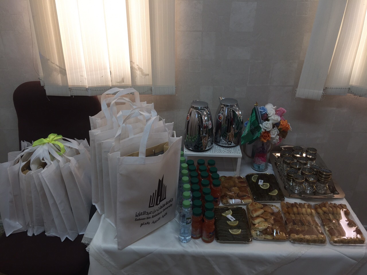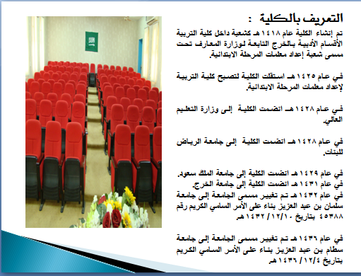 استقبل الوفد مشرفة العلاقات العامة والإعلام أ. سارة الدوسري بعدها توجهه الوفد لمكتب عميدة الكلية د.حنان مانع الجهني التي رحبت بالوفد ودارت مناقشات وتساؤلات للوفد عن تجربة العميدة العلمية والعملية في قيادة الكلية حيث وضحت سعادتها سعيها إلى خلق روح الفريق الواحد والتعاون بين منسوبات الكلية في العمل وأنه من أهم أسباب نجاح القيادة في العمل بعدها قام الوفد بجولة داخل مرافق الكلية صحبهم فيها مشرفة العلاقات العامة أ. سارة الدوسري والأستاذة أميرة الجيزاني مشرفة الشؤون المالية والإدارية وبعد الانتهاء من الجولة تمت استضافة الوفد بقاعة الخنساء ومن ضمن فقرات برنامج الضيافة تقديم فيلم وثائقي عن الكلية بعدها محاضرة تعريفية بالكلية رؤيتها ورسالتها والأهداف وأهم الأقسام والإنجازات التي حققتها الكلية في مسيرتها العلمية والعملية .