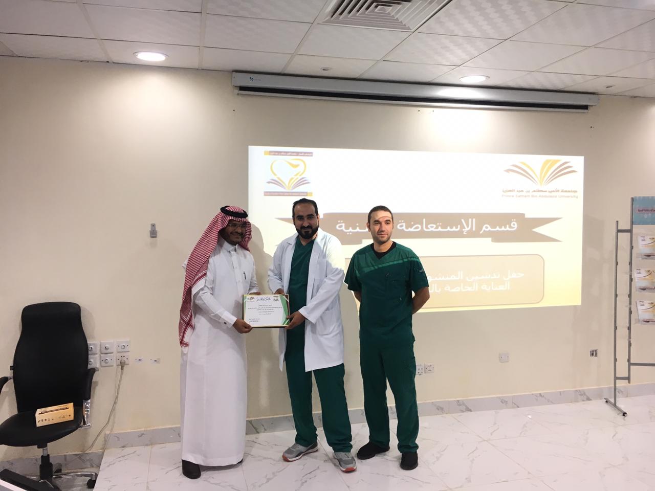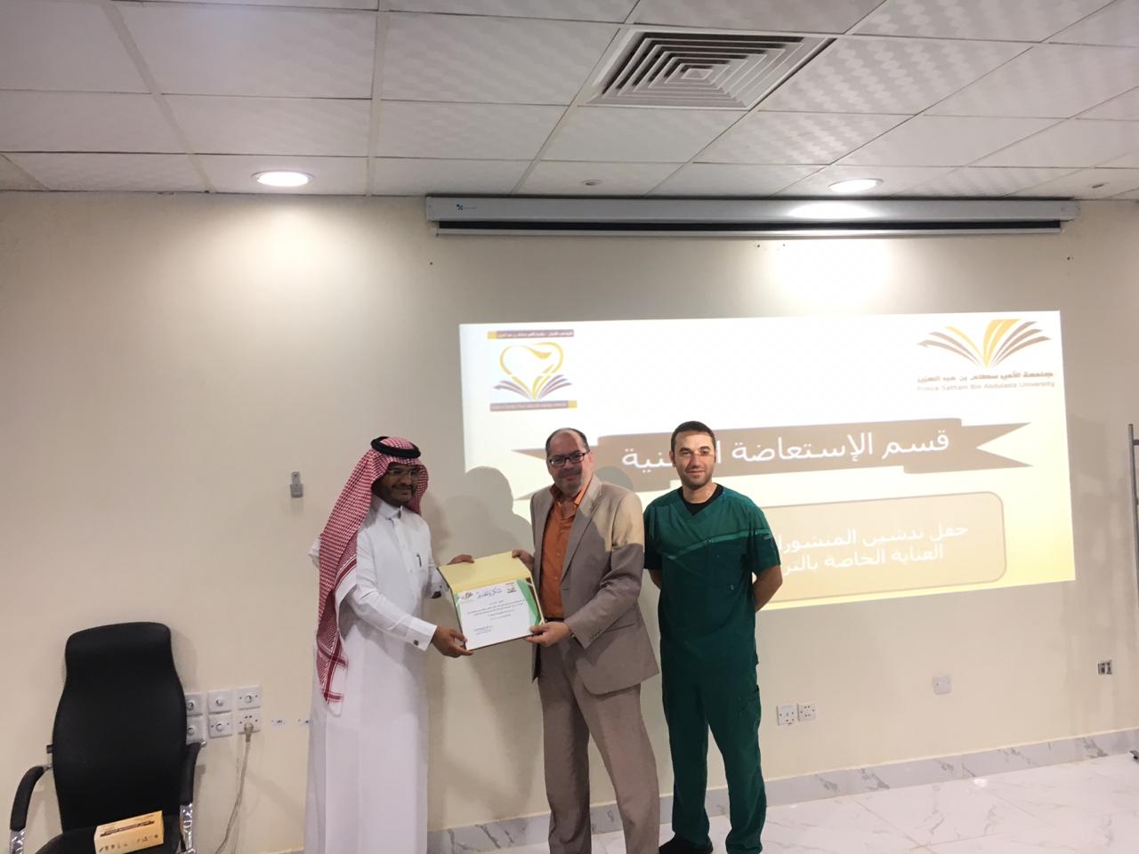 وقد بدأت فقرات الحفل الذي كان من تقديم الطالب طلال آل رشيد بآيات من الذكر الكريم تلاها الطالب عبد الرحمن العتيبي بعد ذلك قام رئيس قسم الاستعاضة السنية الدكتور خالد الزهراني بالتحدث عن هذه المبادرة والتي تهدف إلى الارتقاء بمستوى العناية المقدمة للمرضى من خلال هذه المنشورات التوعوية عن كيفية العناية بالتركيبات المتحركة والثابتة والمؤقتة والتي كتبت بأسلوب سهل ومفهوم للشخص الغير متخصص وأضاف الدكتور أيضاً بأن صندوق العناية بمرضى التركيبات المتحركة تم عمله لمساعدة المرضى والذين هم في الغالب من كبار السن على الاهتمام بهذا النوع من التركيبات والتي تتطلب عناية خاصة .