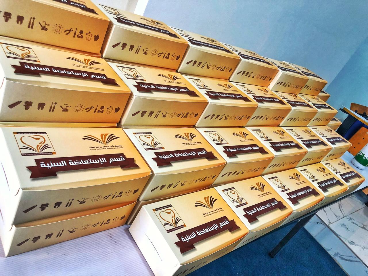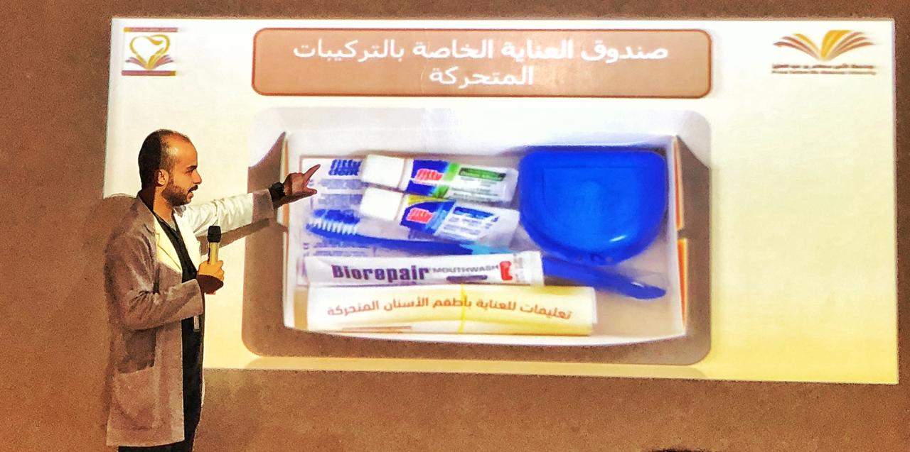 بعد ذلك قدم الدكتور أحمد الجوهر المعيد بقسم الاستعاضة السنية عرضا مرئياً عن مكونات الصندوق والذي يحتوي على صندوق حفظ الأطقم المتحركة، المعجون اللاصق، كبسولات التعقيم، فرشاة الأسنان، معجون الأسنان ، غسول الفم ، ومنشور عن العناية بالتركيبات المتحركة.