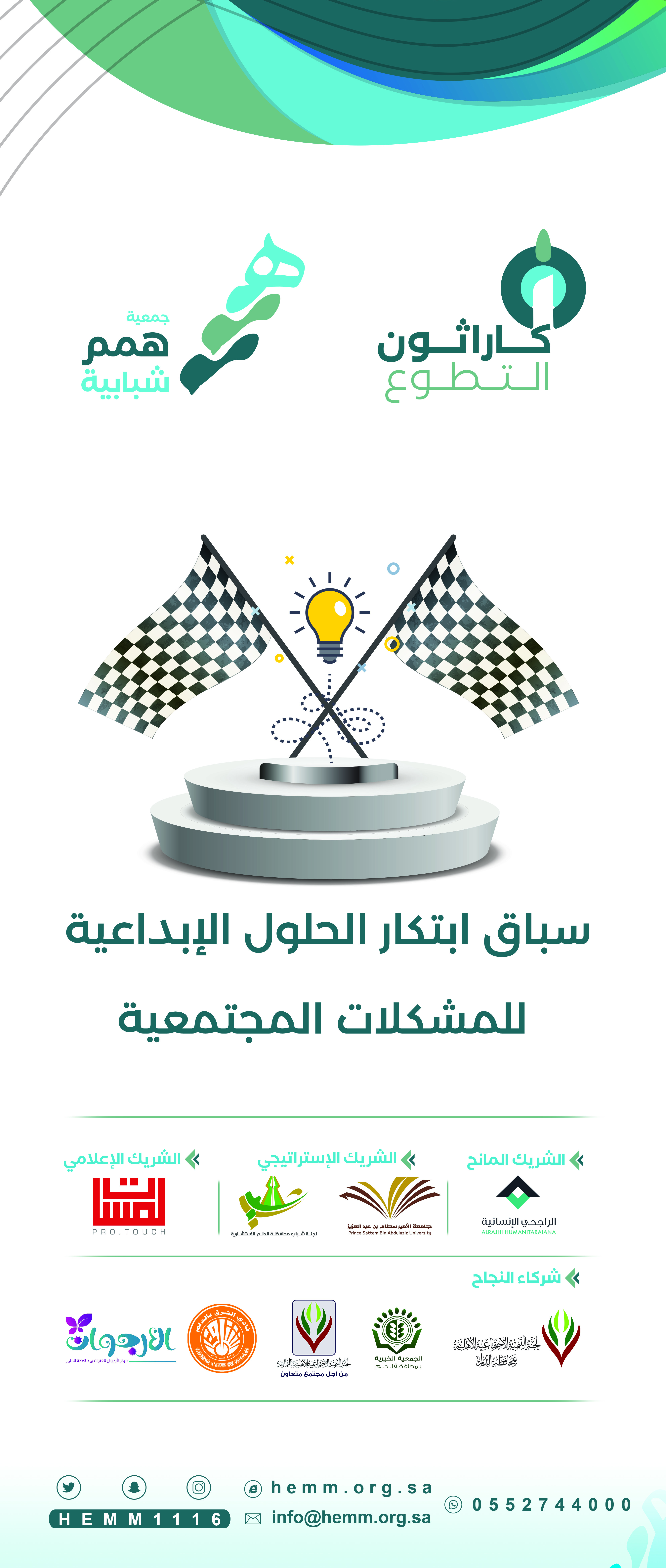 برعاية محافظ محافظة الدلم الأستاذ / فهد بن سلطان بن حميد تنطلق مبادرة كاراثون التطوع والذي يهدف إلى المنافسة وابتكار الحلول الإبداعية للمشكلات المجتمعية التطوعية وبشراكة استراتيجية بين جامعة الأمير سطام بن عبدالعزيز ممثلة بكلية العلوم والدراسات الانسانية بالخرج وجمعية همم الشبابية تنعقد هذه المبادرة المميزة
