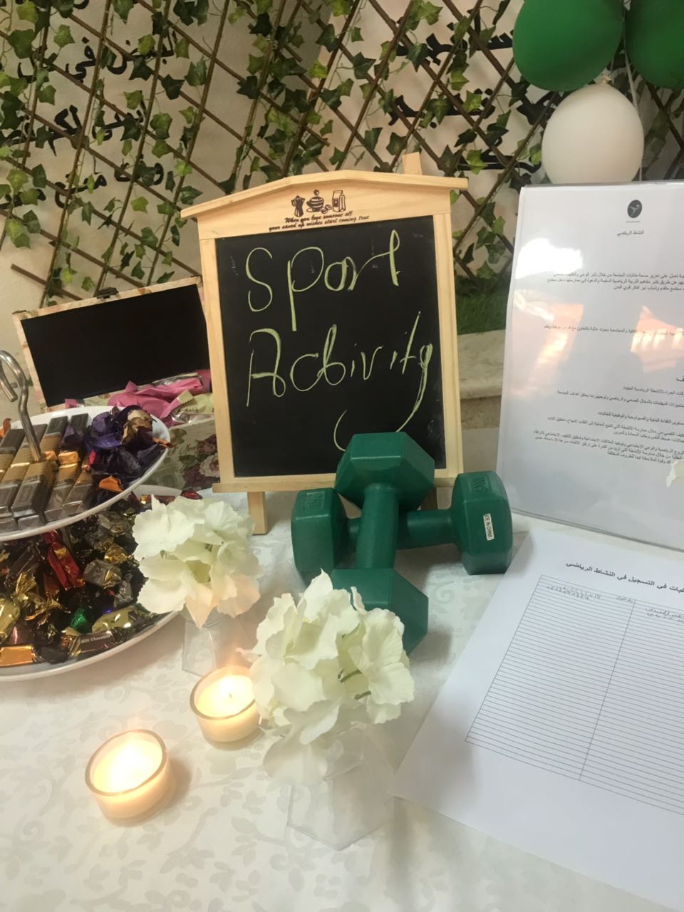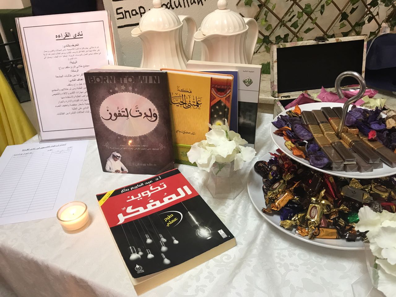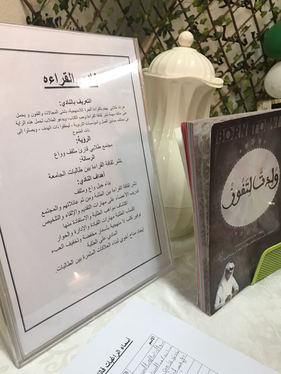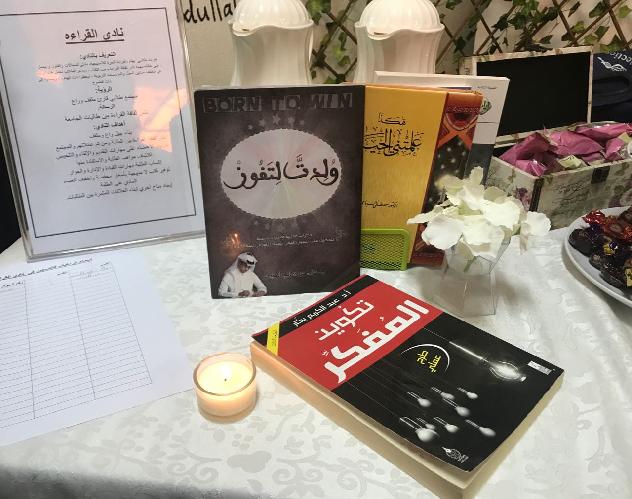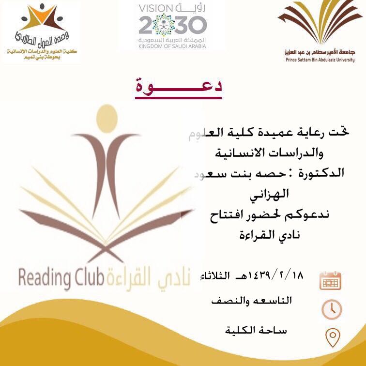 تحت رعاية عميدة كلية العلوم والدراسات الانسانية بحوطة بني تميم الدكتورة حصة الهزاني وبالتعاون مع وحدة العمل الطلابي تم تدشين (نادي القراءة) والنشاط الرياضي الثقافي وذلك في تمام الساعة ٩:٣٠ صباحا من يوم الثلاثاء الموافق 18 /2 / 1439 هـ في ساحة الكلية. تم خلال التدشين عرض الأركان التعريفية عن نادي القراءة والنشاط الرياضي والتي تحوي الرسالة والرؤية والأهداف المتعلقة بهما، كما تم تقديم استمارات للراغبات في الانضمام لهذه الاندية حيث تم تسجيل حوالي ٣٠ من طالبات ومنسوبات الكلية لنادي القراءة، أما بالنسبة للنشاط الرياضي فقد تم تسجيل حوالي ٣٢ عضوة.