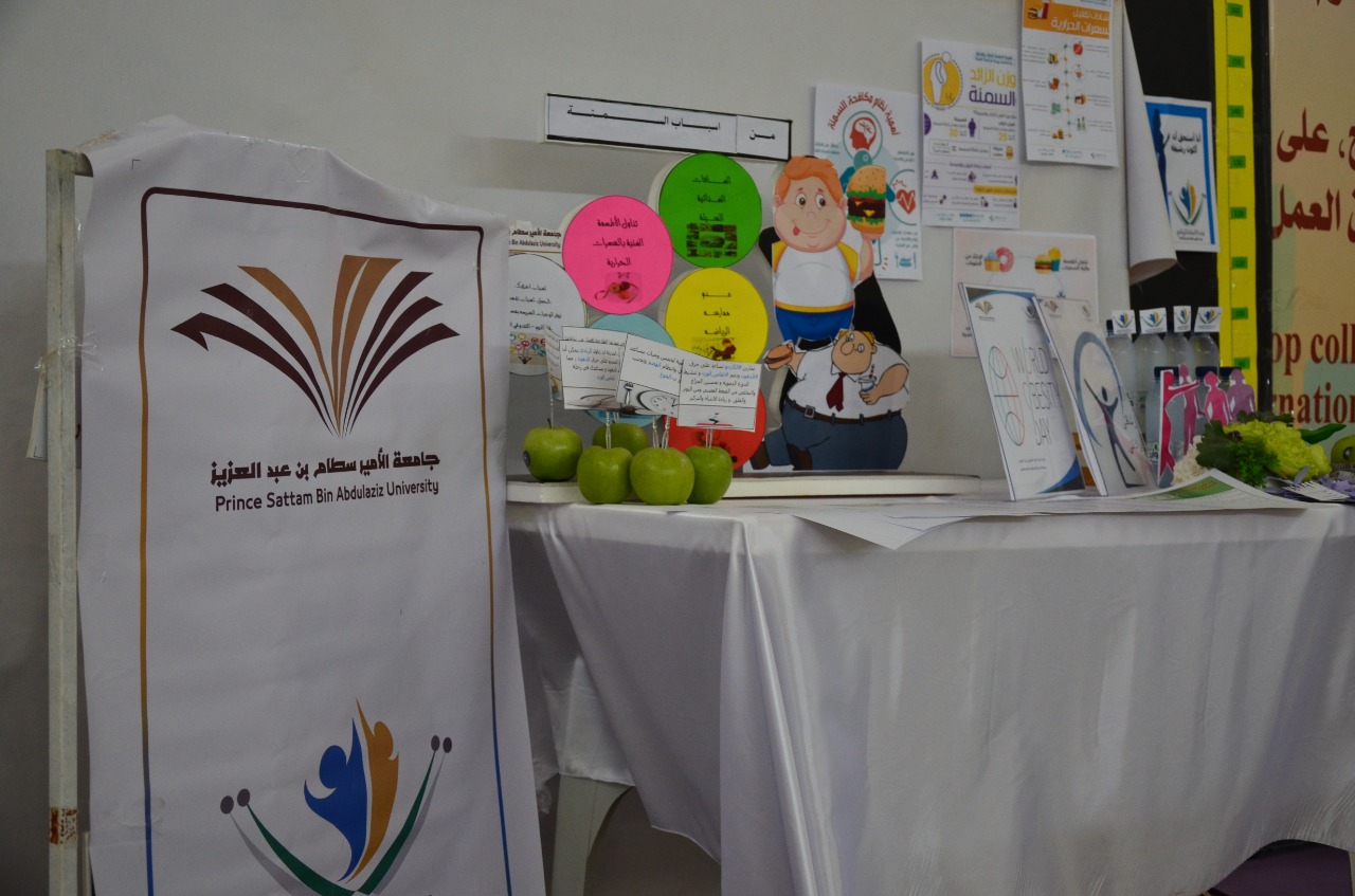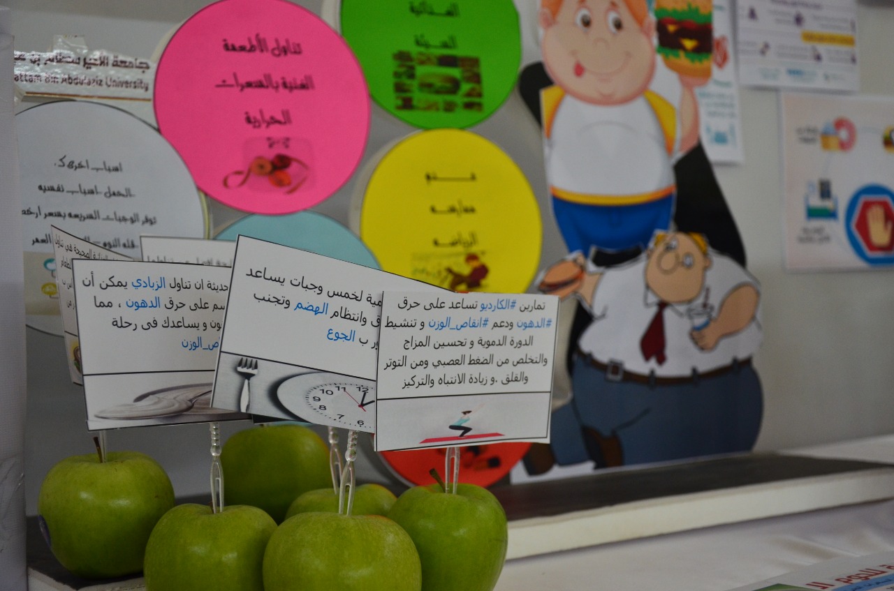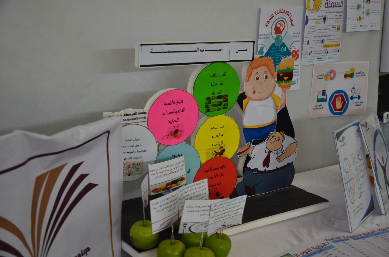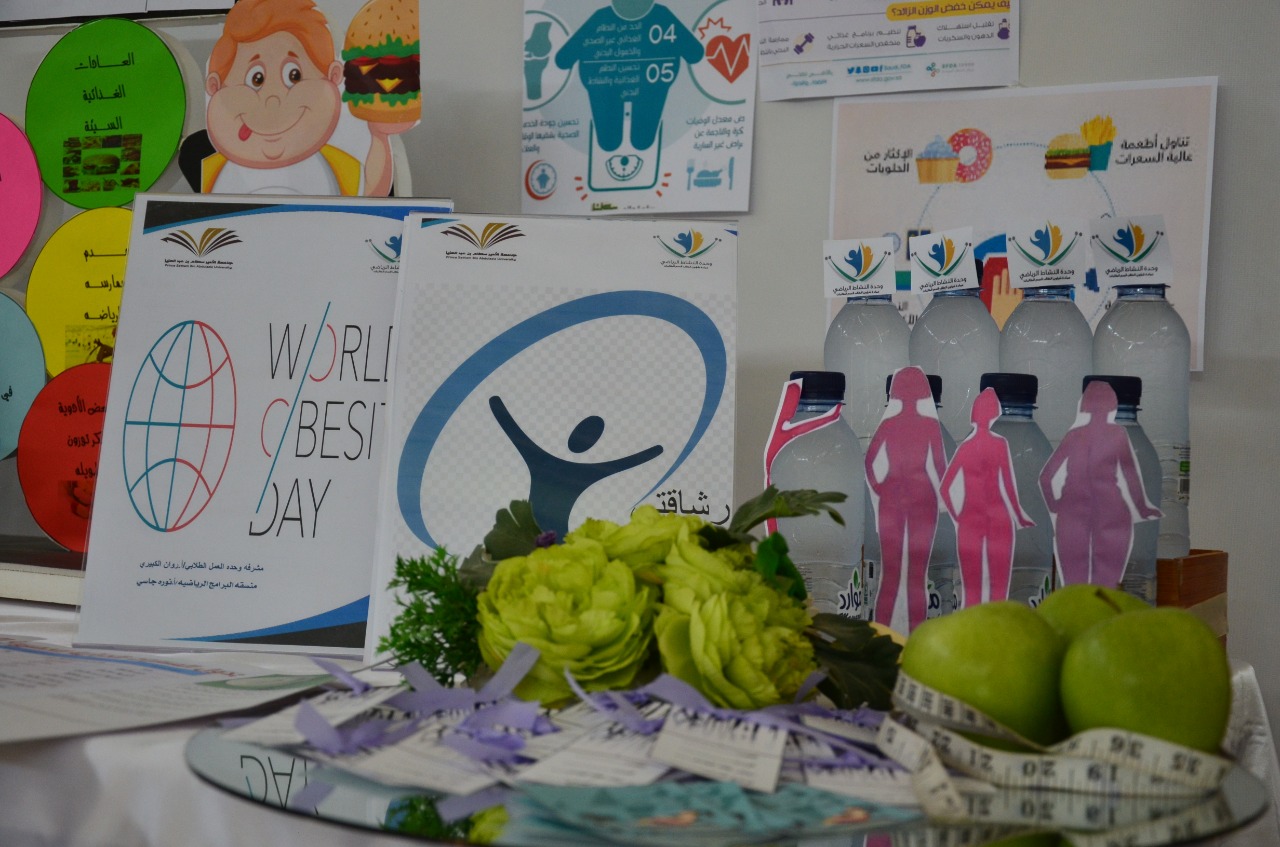 أقامت وحدة العمل الطلابي ممثلة بالبرامج الرياضية بكليات الأفلاج (قسم الطالبات) يوم الخميس 1441/2/11هـ الساعة العاشرة صباحاً في بهو مبنى الأقسام العلمية برنامج رشاقتي بإرادتي بمناسبة اليوم العالمي للسمنة، يهدف البرنامج إلى التوعية بأضرار السمنة وعواقبها على صحة الإنسان، ونشر الحلول لها وكيفية الوقاية منها، والتعريف بالسعرات الحرارية التي يحتاجها الإنسان ويحرقها الجسم بالنشاط اليومي، والتوعية بالأنماط الغذائية الصحية، والحث على الرياضة اليومية.