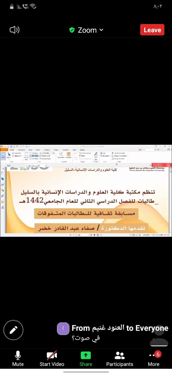تحت رعاية سعادة عميد الكلية د.فيصل السبيعي حفظه الله وسعادة وكيلة الكلية د.سعدية حسن حفظها الله ، أقامت مكتبة كلية العلوم والدراسات الإنسانية بالسليل ( شطر الطالبات )ضمن فعاليات تنشيط دور المكتبة للفصل الدراسي الثاني للعام الجامعي ١٤٤٢ هــ مسابقة ثقافية للطالبات المتفوقات وذلك يوم الأربعاء الموافق ٢٦ / ٧ / ١٤٤٢ هــ