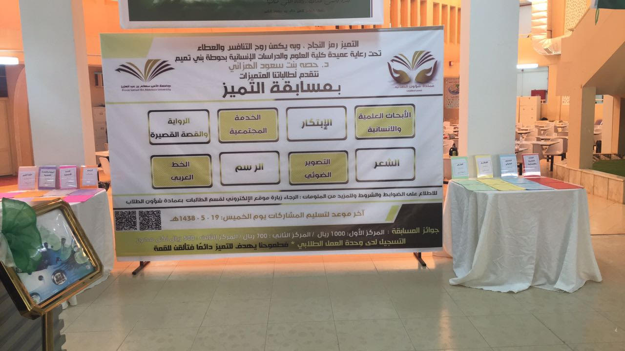 تلقت وحدة العمل الطلابي بكلية العلوم والدراسات الإنسانية بحوطة بني تميم مسابقة التميز من قبل عمادة شؤون الطلاب (فرع الطالبات) لنشرها للطالبات وتم تفعيلها مباشرة بالإعلان في ساحة الكلية وبدأت مشرفة المسابقة أ/ منال الدحيم بتوزيع المحاور على مشرفات في مختلف التخصصات من أعضاء هيئة التدريس والإداريات بالكلية يتابعن الطالبات ويقدمن لهن ماهو صالح ومفيد وذلك يوم الإثنين الموافق 27/ 3/ 1438هـ وتعد أ/ منال الطالبات بمدربات سيقدمن للطالبات الجديد والمفيد وقد حظيت المسابقة بإعجاب الطالبات وإقبالهن ساعيات للوصول نحو التميز.