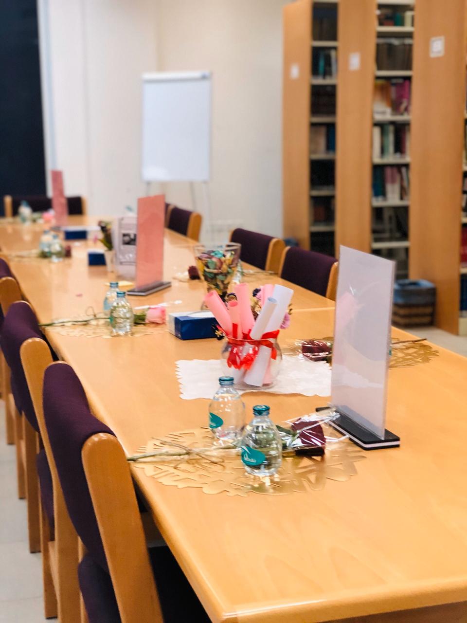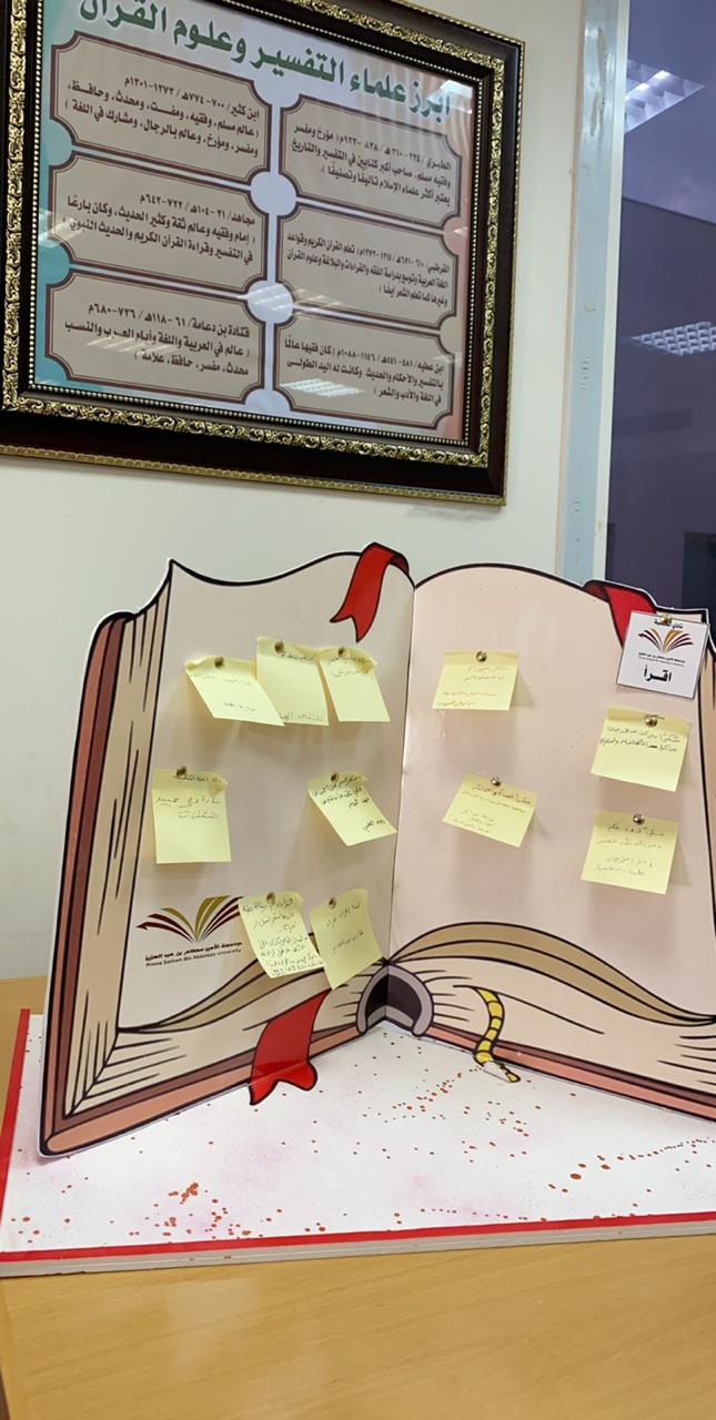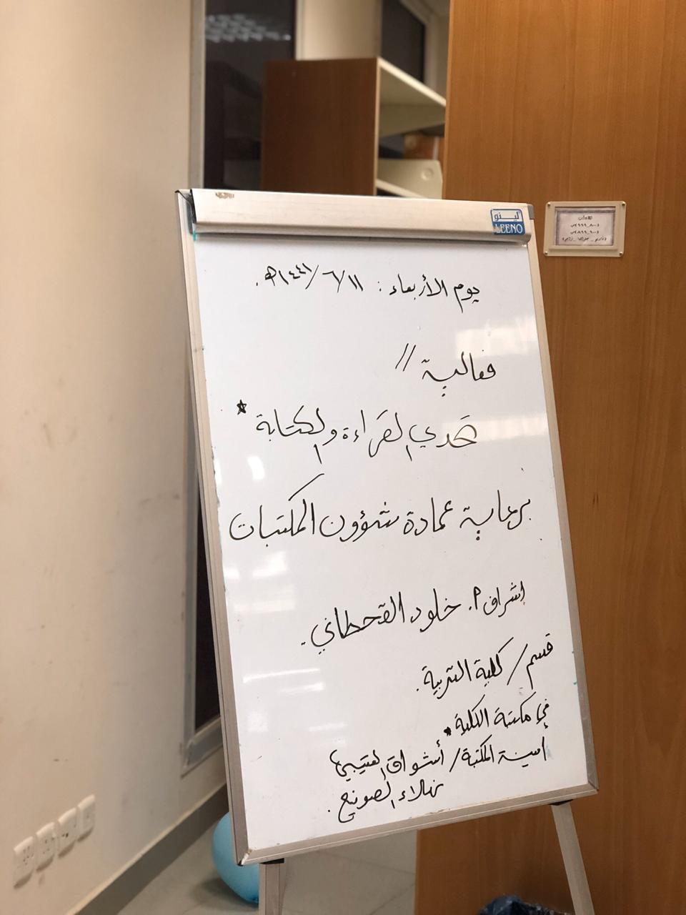 نظمت مكتبة الكلية يوم الأربعاء 11/ 6 / 1441هـ , فعالية بعنوان ( تحدي القراءة والكتابة ) ، تحت إشراف أ/خلود القحطاني من عمادة شؤون المكتبات ,و أمينة المكتبة أ/نهلة الصوينع–و أ/ أشواق العتيبي. تمت مناقشة مجموعة من الكتب منها (محمد كأنك تراه) ( التربية الجادة ضرورة ) و( المضامين التربوية وصايا لقمان ) حيث تفاعل معها الجميع ، إضافه إلى إقامة ثلاث مسابقات من ضمن فقرات الفعالية استهدفت بنات الشهداء وأمهاتهن . كما حضت الفعالية استحسان الجميع وإدخال البهجة في نفوسهم.