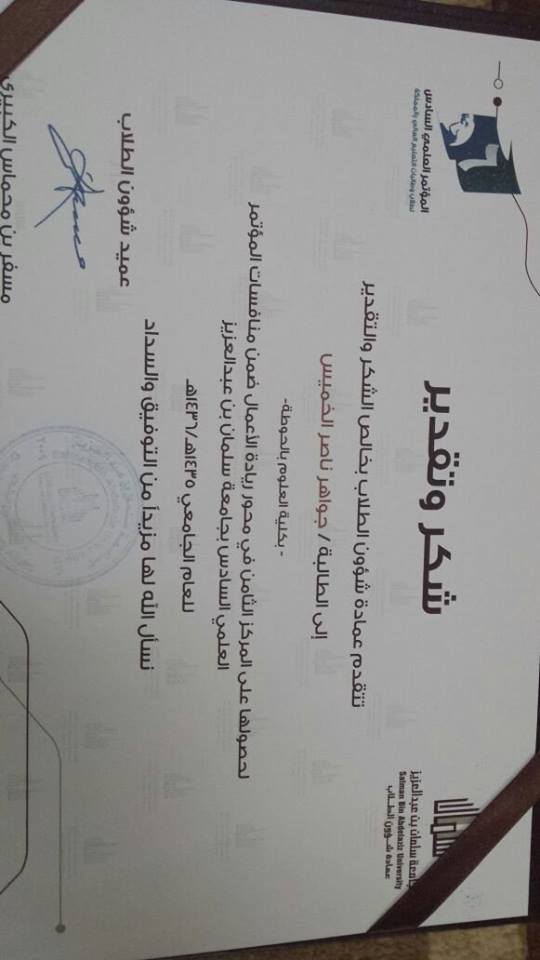 ، وأخيرا حصلت الكلية على المركز الأول على مستوى جامعة سلمان بن عبد العزيز والتي يبلغ عدد كلياتها 22 كلية في مسابقة تقييم جهود الكليات العامة للمشاركة في المؤتمر السادس لطلاب وطالبات التعليم العالي للبنات وهى المرة الأولى في تاريخ الكلية وهذا انجازا تفخر به الكلية ووساما على صدر كلية العلوم والدراسات الإنسانية بحوطة بني تميم