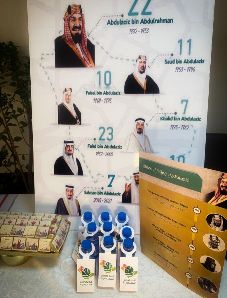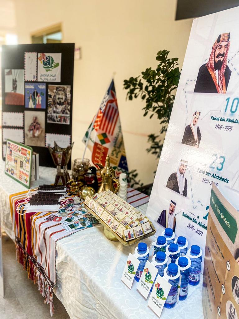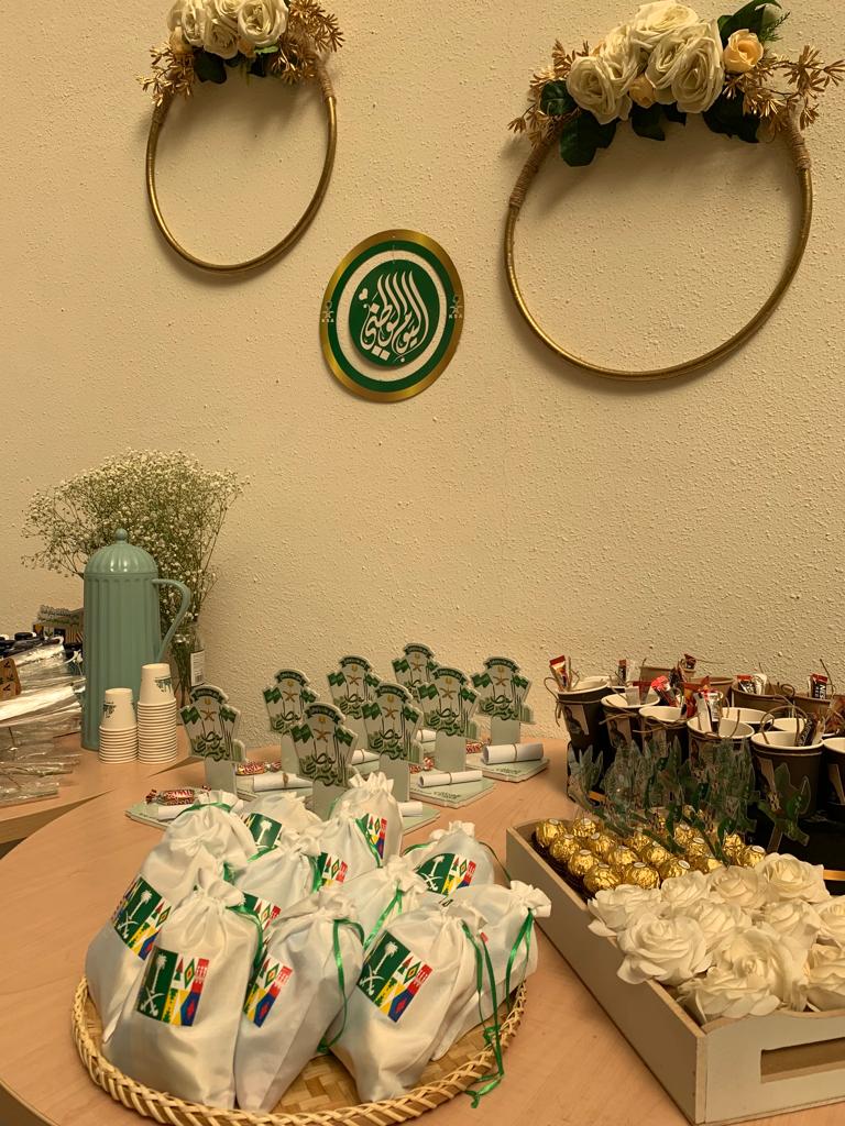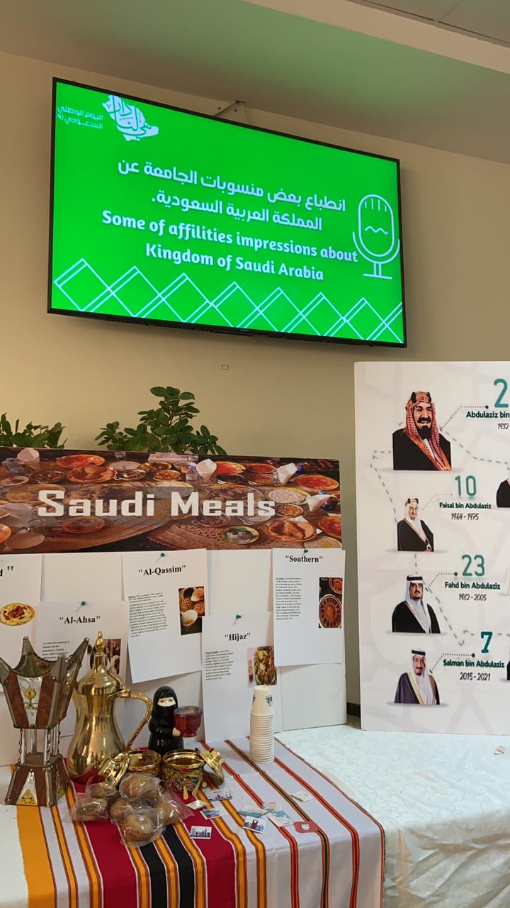 في يوم بهيج اكتست ساحات كلية العلوم والدراسات الإنسانية (أقسام الطالبات) بالخرج بحلة الاحتفاء باليوم الوطني 91 بمشاعر الحب والانتماء لمملكتنا الغالية تحت رعاية من وكيلة الكلية د نوال الفهيد وذلك في يوم الاثنين الموافق 20/2/1443هـ في الساعة التاسعة صباحًا في ساحات الكلية وبتفاعل كبير من جميع الأقسام وتحت شعار هي لنا دار حيث قام قسم اللغة الإنجليزية بعمل ركن يستعرض فيه النقوش السعودية والأكلات في المناطق المختلفة من مملكتنا الحبيبة وتم شرحها من قبل طالبات القسم باللغة الإنجليزية وتم عرض فيديوهات للطالبات تستعرض ما تم عرضه بالإضافة لتسجيل مشاعر أعضاء القسم من غير الناطقين باللغة العربية بهذا المناسبة وفي لوحة فنية بهيجة قام قسم الرياضيات بعمل ركن حيث قدمت الطالبات لوحات فنية واكواب تم التعبير فيها عن مشاعر حب اتجاه الوطن كم تم عمل مسابقة اعرف وطنك أكثر, وبإبداع من أنامل طالبات قسم الفيزياء متمثل بنادي فيزياء الحياة أقيم ركن عبارة عن لوحات جدارية تستعرض إصدارات العملة السعودية منذ تأسيس المملكة واستعراض اهم المناطق الاثرية في مدينة الرياض وأيضًا شارك قسم الاحياء بركن ترحيبي بهذه المناسبة.