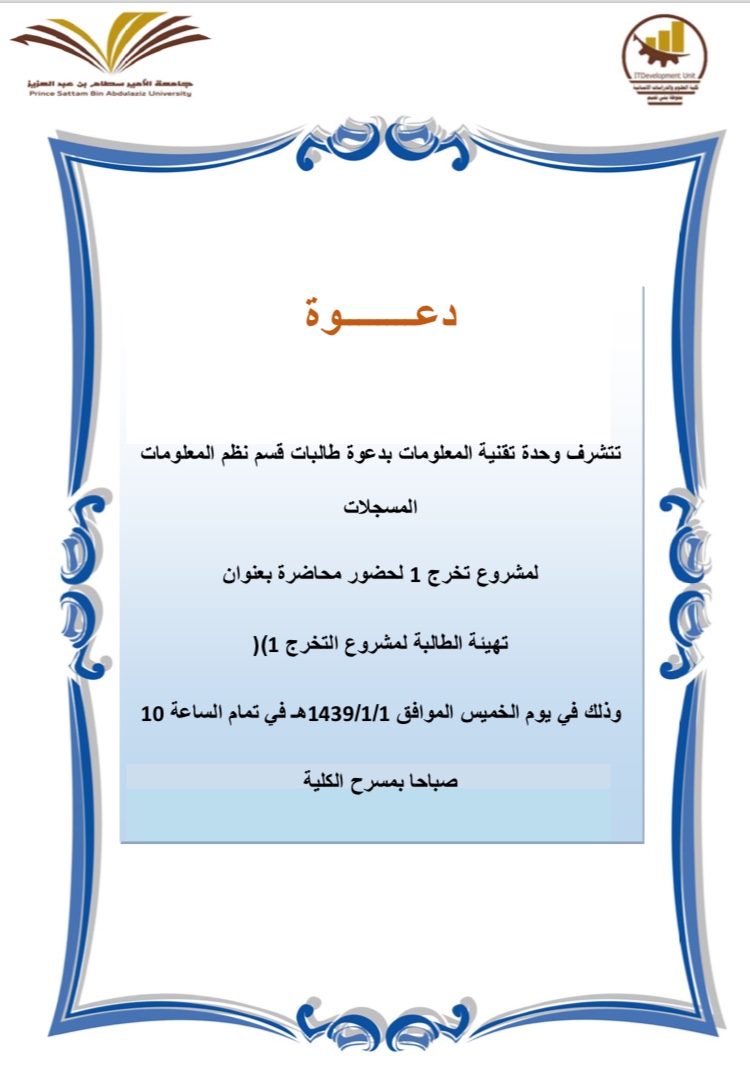أقامت وحدة تقنية المعلومات بالتعاون مع قسم نظم المعلومات بكلية العلوم والدراسات الإنسانية بحوطة بني تميم برنامج تهيئة طالبات قسم نظم المعلومات المستوى السادس لمشروع التخرج وذلك بحضور أعضاء وطالبات قسم نظم المعلومات يوم الخميس الموافق 1/1/ 1439 هـ في مسرح الكلية. هدف البرنامج إلى تعريف الطالبات بمشروع التخرج وأهدافه وطريقة سير المشروع خلال العام الدراسي. كما تم توزيع الطالبات إلى مجموعات وتحديد المشرفات على كل مجموعة والرد على استفسارات الطابات وأسئلتهم.