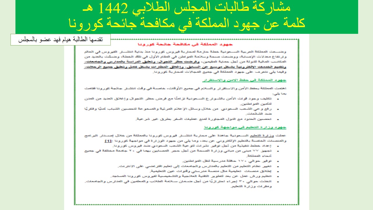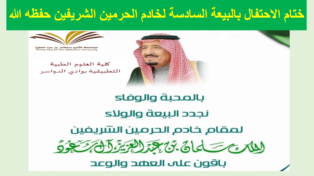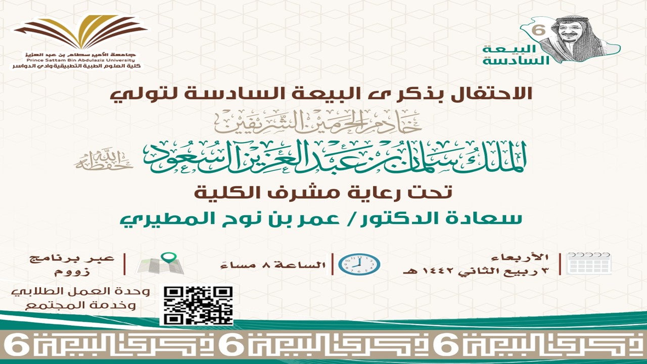 ثم تلى ذلك مشاركة عرض مرئي من سعادة الدكتور عمر بن نوح المطيري (المشرف علي الكلية) اشتمل على مبايعة الملك سلمان بن عبد العزيز آل سعود - حفظه الله و ولي عهده الأمير محمد بن سلمان- حفظه الله وتجديد العهد بالولاء والوفاء والسمع والطاعة من أسرة كلية العلوم الطبية التطبيقية بوادي الدواسر. بعد ذلك تم تقديم كلمة عن إنجازات الملك سلمان حفظه الله في ذكرى البيعة السادسة: وقد اشتملت الكلمة على الإنجازات الداخلية, الخيرية, العالمية, للمرأة, إنجازات ولي العهد بتوجيه من الملك, في مجال التعليم, و أهم المشاريع التي قام بها في مكة المكرمة والمدينة المنورة قدمتها سعادة الدكتورة عطيات محمد حسن (مشرفة وحدة العمل الطلابي و وحدة خدمة المجتمع). بعد ذلك تم عرض مشاركة طالبات المجلس الطلابي 1442 هـ وقد بدأت مشاركاتهم بتقديم كلمة عن جهود المملكة في مكافحة جائحة كورونا: منها فرض حظر التجوال، وتعليق الدراسة بالمدارس والجامعات، وتقديم الخدمات الإلكترونية ، و إغلاق المطارات, وتعليق الرحلات, جهود المملكة في حفظ الأمن والإستقرار, جهود وزارة التعليم, جهود وزارة الصحة, الجهود الإقتصادية لمواجهة كورونا, الإنجازات السعودية في كورونا 2020 قدمتها الطالبة هيام فهد عضو بالمجلس الطلابي.