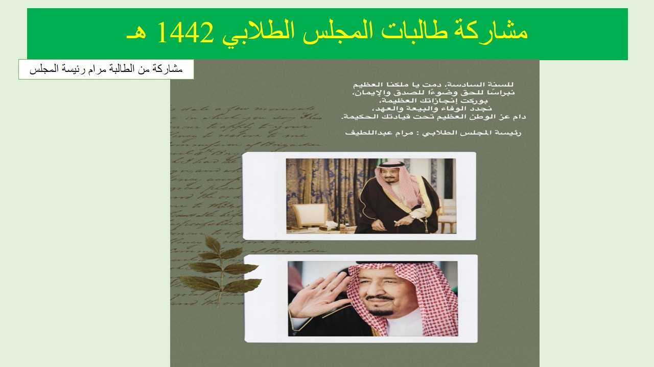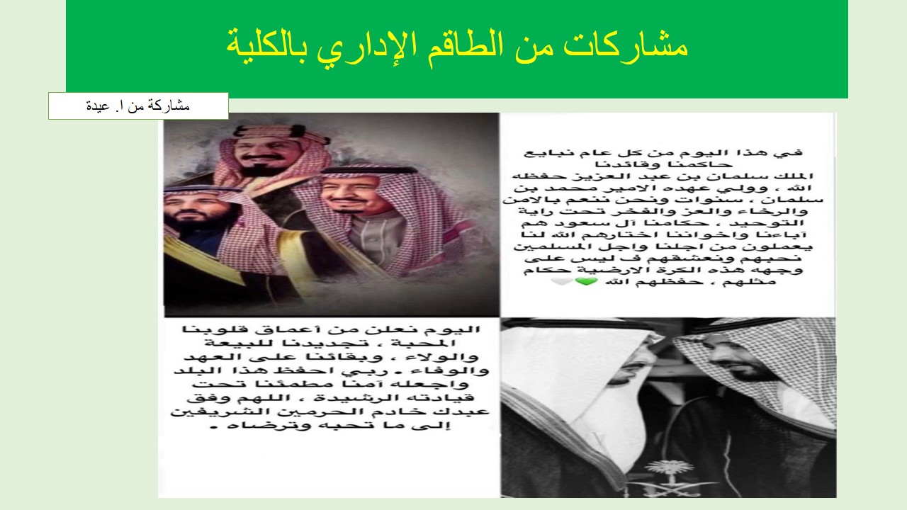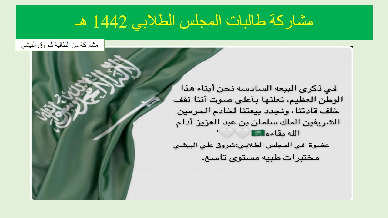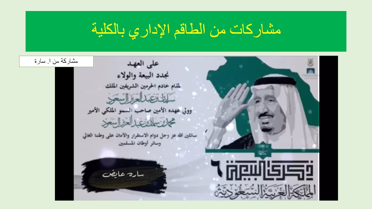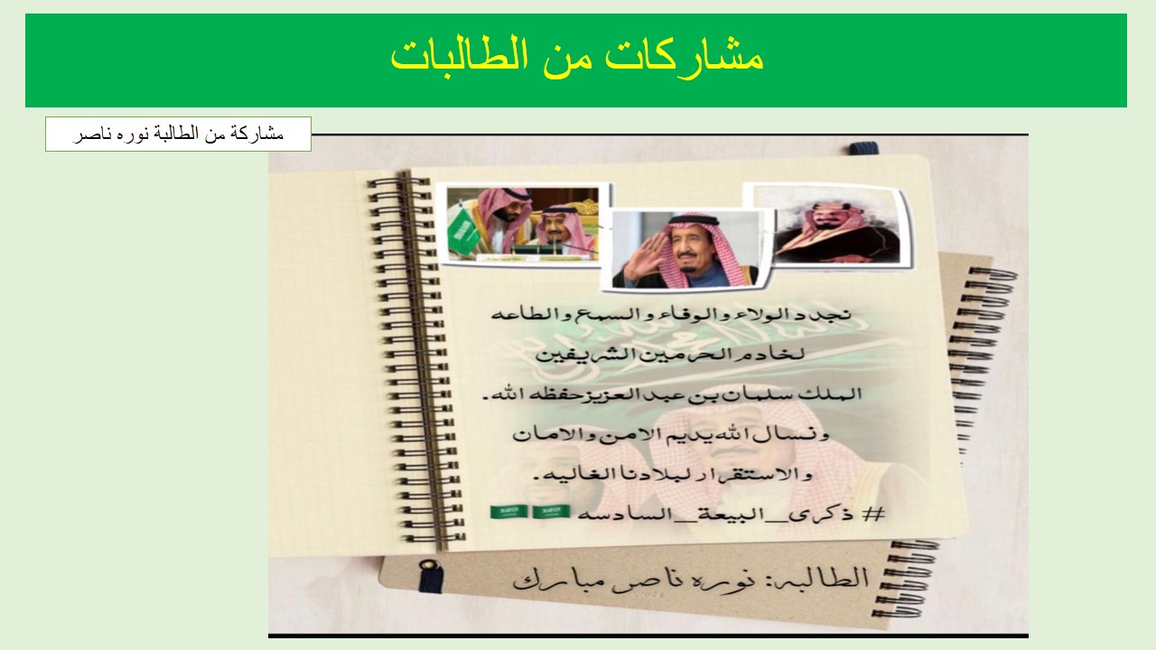أيضا تم عرض مشاركات طالبات المجلس كلها تعبر عن ذكرى و تجديد البيعة السادسة, مملوءة بعبارات الحب والوفاء والولاء للملك والوطن ، ثم تلى ذلك عرض مشاركات الطالبات بالمستويات و الطاقم الإداري و أعضاء هيئة التدريس بالكلية: اشتملت جميعها على كلمات وعبارات ومشاعر مملوءة بعبارات الحب والوفاء والولاء للملك والوطن بهذه المناسبة العظيمة.