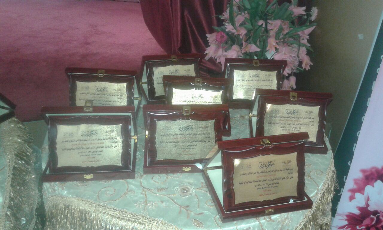 نظمت وحدة العمل الطلابي بكلية التربية بوادي الدواسر يوم الأحد الموافق 25/1/1439هـ حفل تكريم المشاركات في الفعاليات من أعضاء هيئة التدريس والطالبات للعام الجامعي 1437-1438هـ وذلك في مسرح الكلية