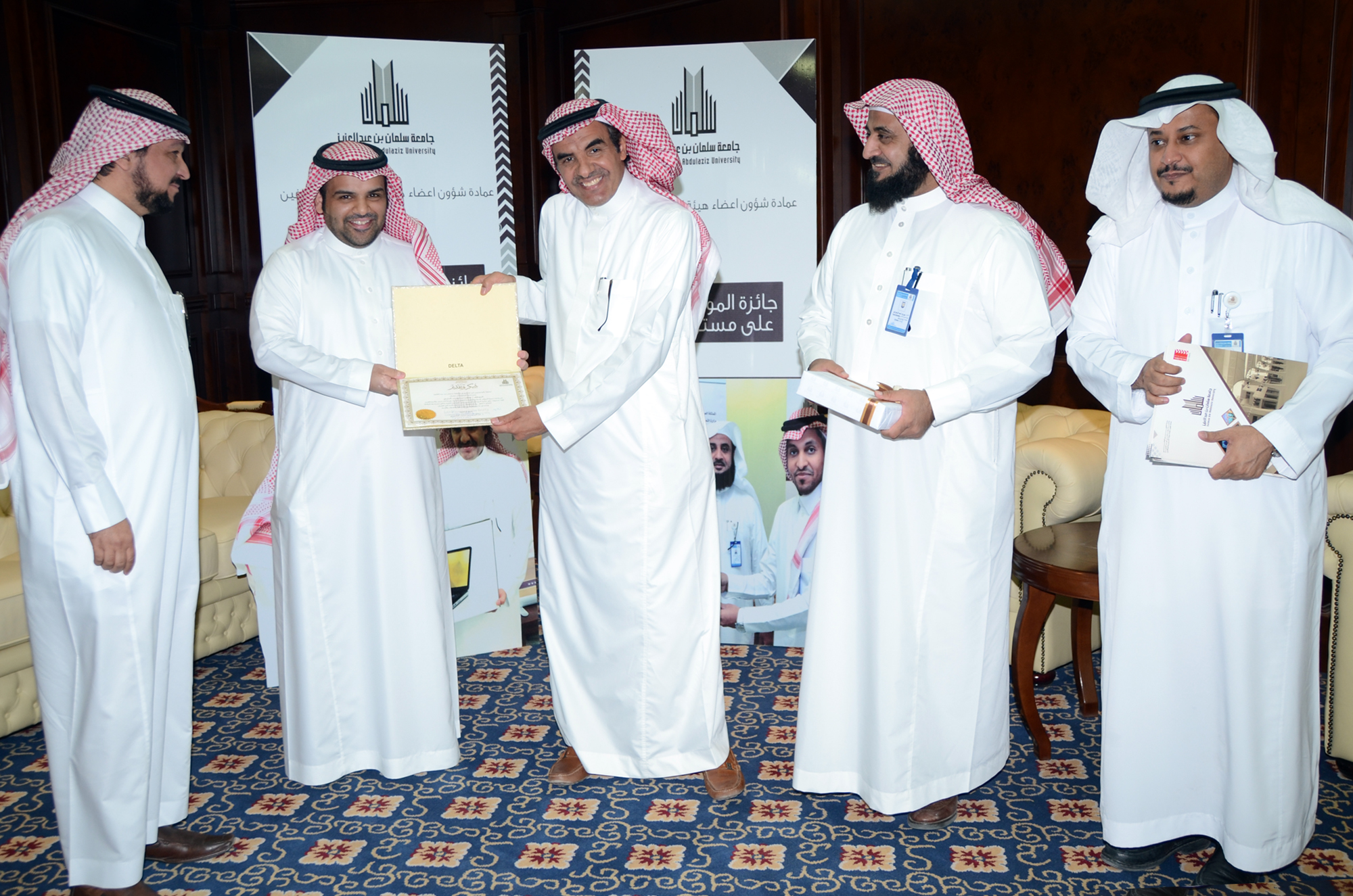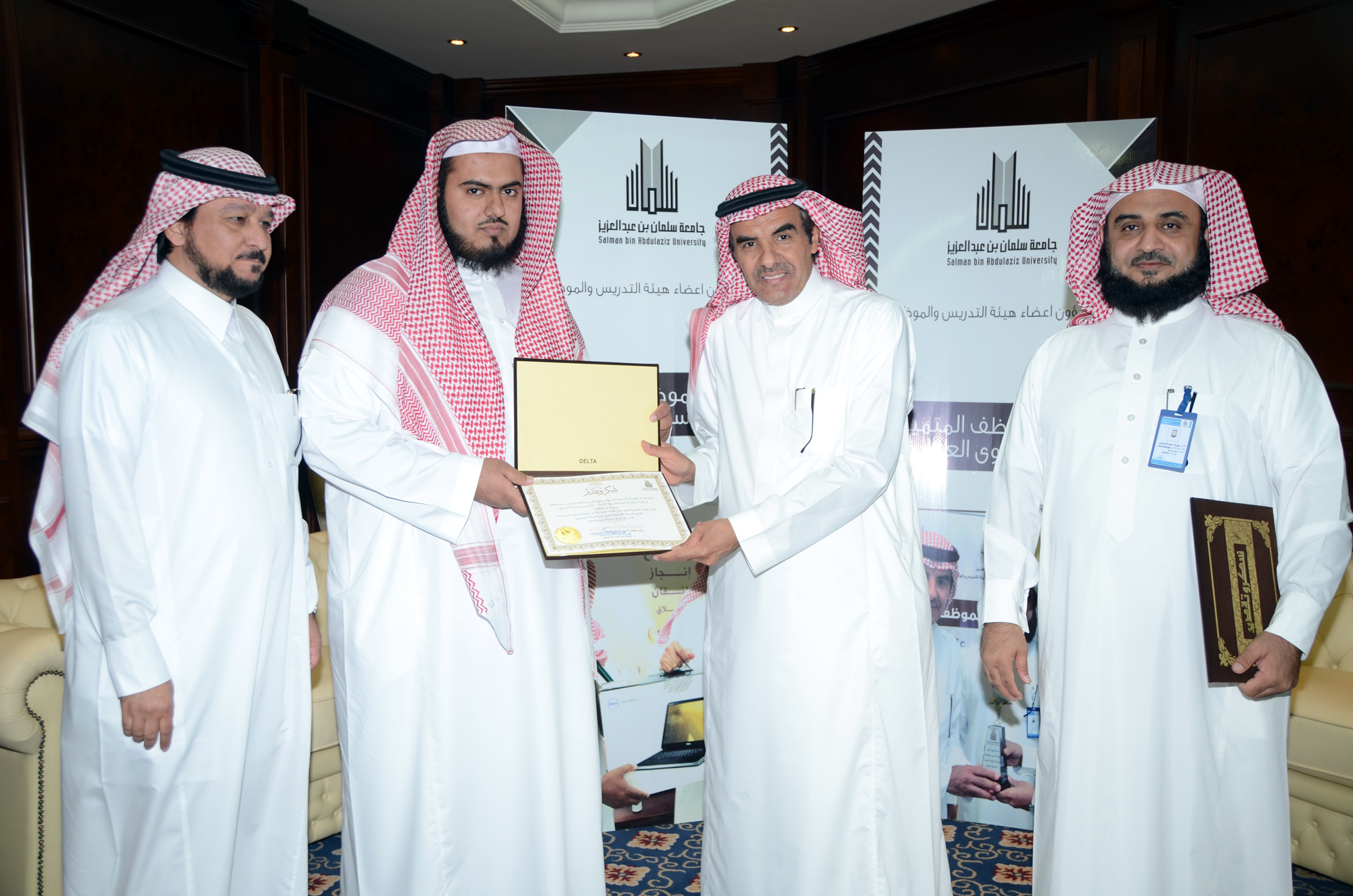 برعاية معالي مدير الجامعة الدكتور عبدالرحمن العاصمي قامت جامعة سلمان بن عبد العزيز ممثلة بعمادة شؤون أعضاء هيئة التدريس والموظفين في يوم الأربعاء الموافق 22/7/1435هـ بتكريم الموظفين الحائزين على جائزة الموظف المتميز بنسختها الثالثة وهم: