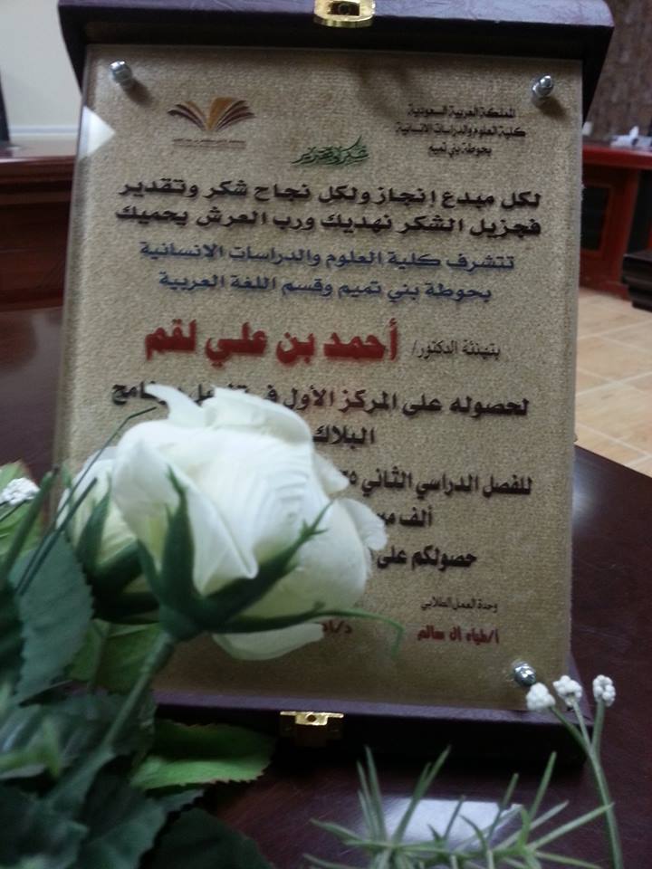 في إطار تشجيع عميدة كلية العلوم والدراسات الإنسانية بحوطة بني تميم لكل متميز ومبدع في مجاله فقد كرمت أ. د. عواطف بنت أحمد هندي وقسم اللغة العربية د. أحمد علي لقم لحصوله على المركز الأول على مستوى الجامعة في تفعيل برنامج البلاك بورد للفصل الدراسي الثاني 1435-1436هـ.