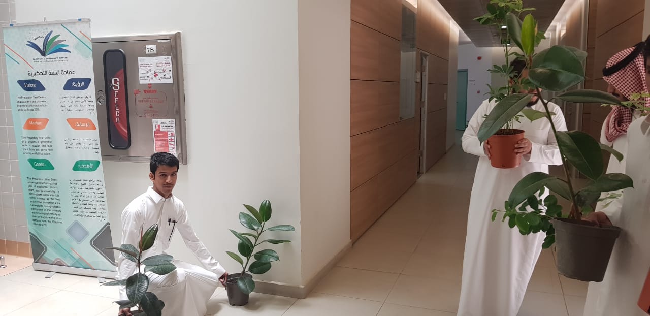 قام مجموعة من طلاب عمادة السنة التحضيرية وبالتعاون مع وحدة الأنشطة الطلابية اليوم الثلاثاء 13/ 11/1440هـ ، و تحت مسمى" تحضيريتي أجمل" بتوزيع بعض نباتات الزينة داخل مرافق العمادة ، وتأتي هذه الفعالية ضمن المبادرات الطلابية التطوعية الصيفية المدرجة ضمن خطة وبرامج وحدة الأنشطة الطلابية ، والتي تهدف إلى تعزيز الأعمال التطوعيَّة لدى الطلاب.