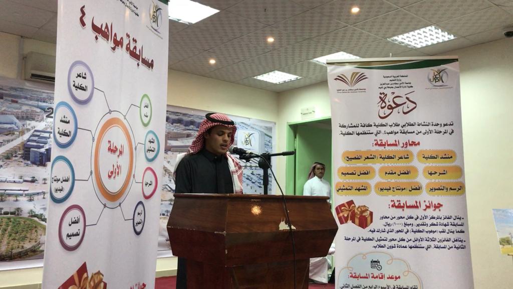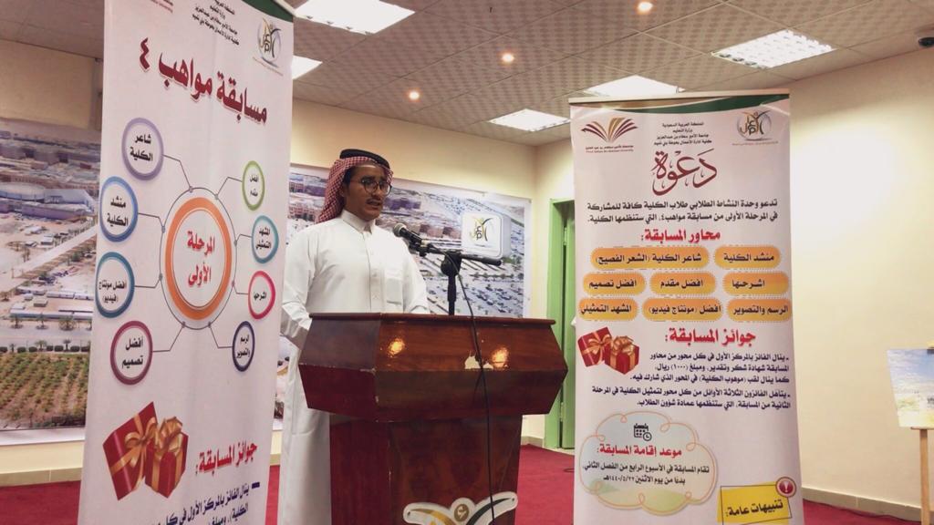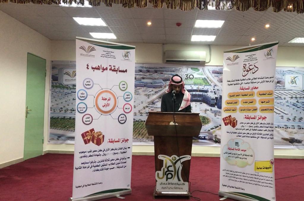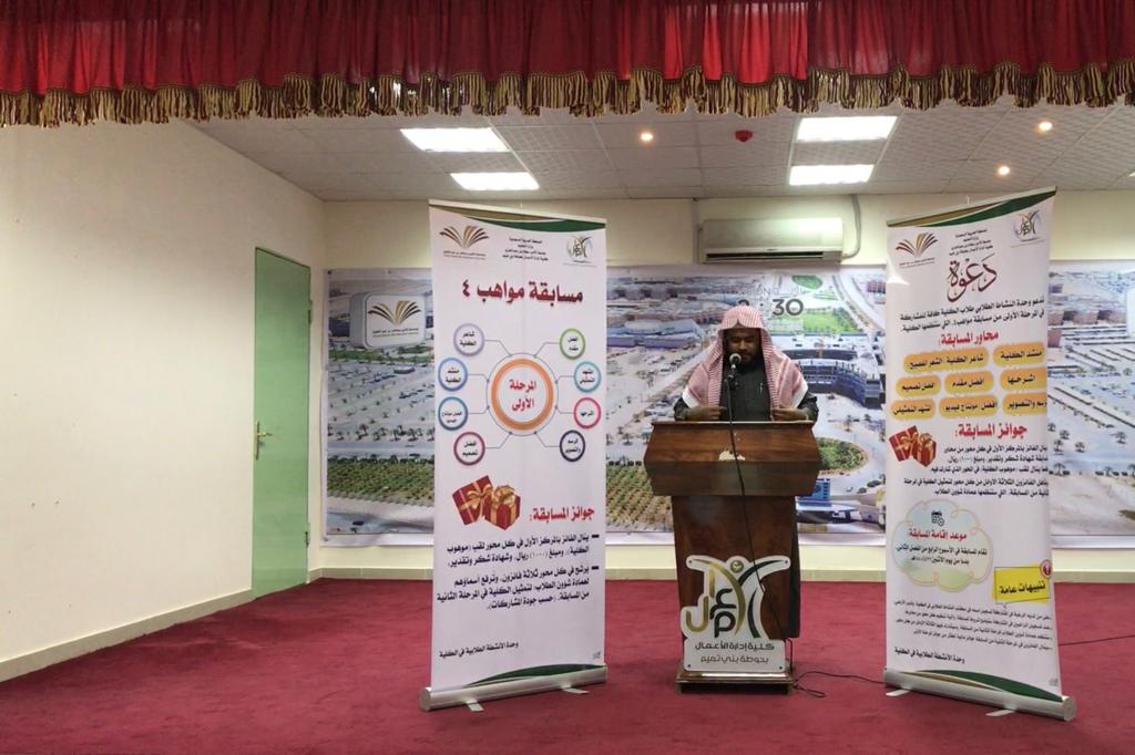 أقامت وحدة الأنشطة الطلابية في كلية إدارة الأعمال في حوطة بني تميم المرحلة الأولى من مسابقة مواهب (٤)، بحضور عميد الكلية د. إبراهيم بن محمد الداود، ووفد عمادة شؤون الطلاب، وعدد من أعضاء هيئة التدريس والطلاب، وذلك في يوم الخميس ١٤٤٠/٦/٢هـ.