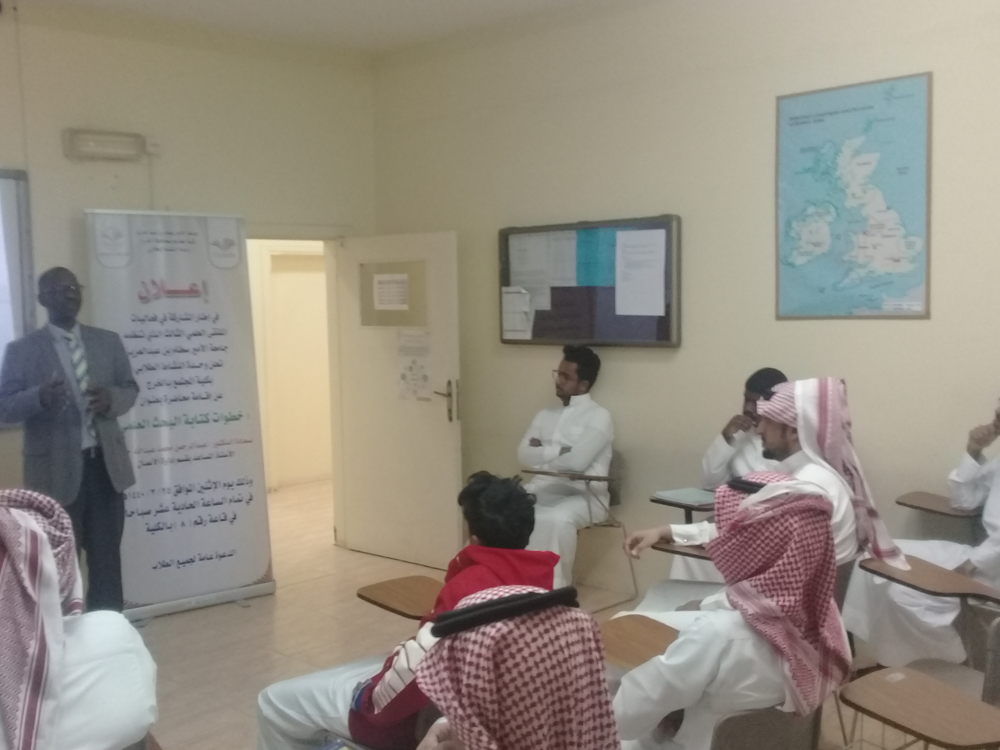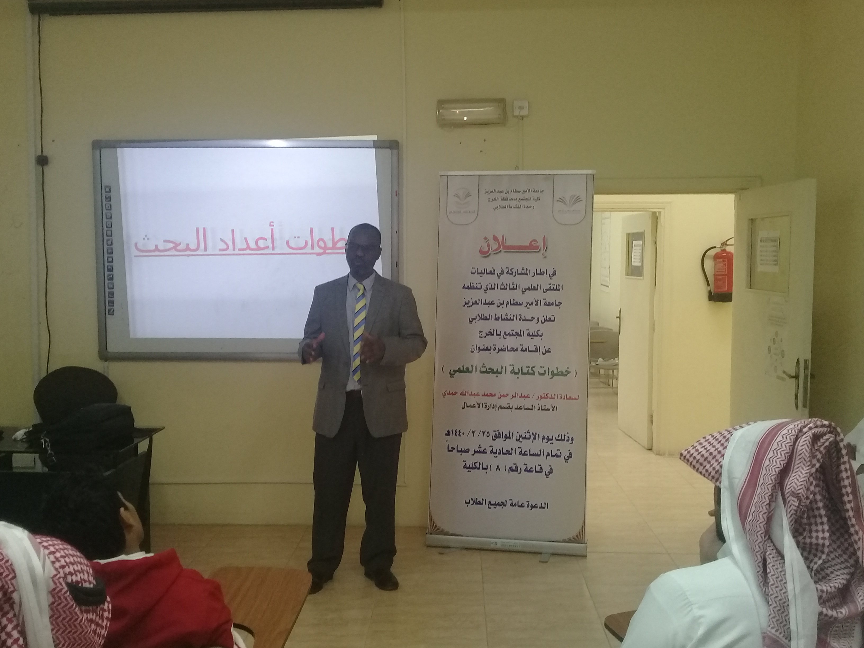 في إطار الاستعداد للملتقى العلمي الثالث الذي تنظمه جامعة الأمير سطام بن عبد العزيز أقامت وحدة النشاط الطلابي بكلية المجتمع بالخرج تحت رعاية سعادة عميد الكلية الدكتور/ حمد بن عبد الله القميزي محاضرة بعنوان" خطوات إعداد البحث العلمي" لسعادة الدكتور / عبد الرحمن محمد عبد الله حمدي الاستاذ المساعد بقسم إدارة الأعمال وقد تناولت المحاضرة تعريف الطلاب بخطوات البحث العلمي بداية من اختيار فكرة البحث حتى صياغة النتائج والتوصيات حيث تم التعريف بالمشكلة والتساؤلات البحثية، ومعايير اختيار المشكلة ، وكيفية تحليل الدراسات السابقة للوقوف على الفجوة البحثية ، وكيفية صياغة الفروض ، كما تناولت المحاضرة طريقة تحديد حجم مجتمع الدراسة وكيفية اختيار العينة، وأهم الاساليب الاحصائية المتبعة في تحليل بيانات الدراسة، وأخير طريقة صياغة النتائج والتوصيات.