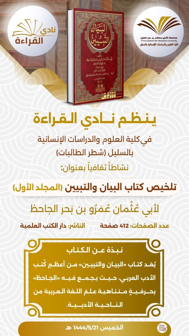 اقامت نادي القراءة في كلية العلوم والدراسات الإنسانية بالسليل ، نشاط تلخيص كتاب (البيان والتبيين) لأبي عُثْمان عُمَرُو بن بَحر الجاحظ "المجلد الأول"، وذلك يوم الخميس بتاريخ 21/05/1444هـ الموافق 15/12/2022م. وقد اجتمع نادي القراءة للمناقشة في تلخيص الكتاب حيث قام أعضاء نادي القراءة إلى تقسيم الكتاب إلى ثلاث مجموعات، حيث قامت كل مجموعة بتلخيص الجزء الخاص بها.