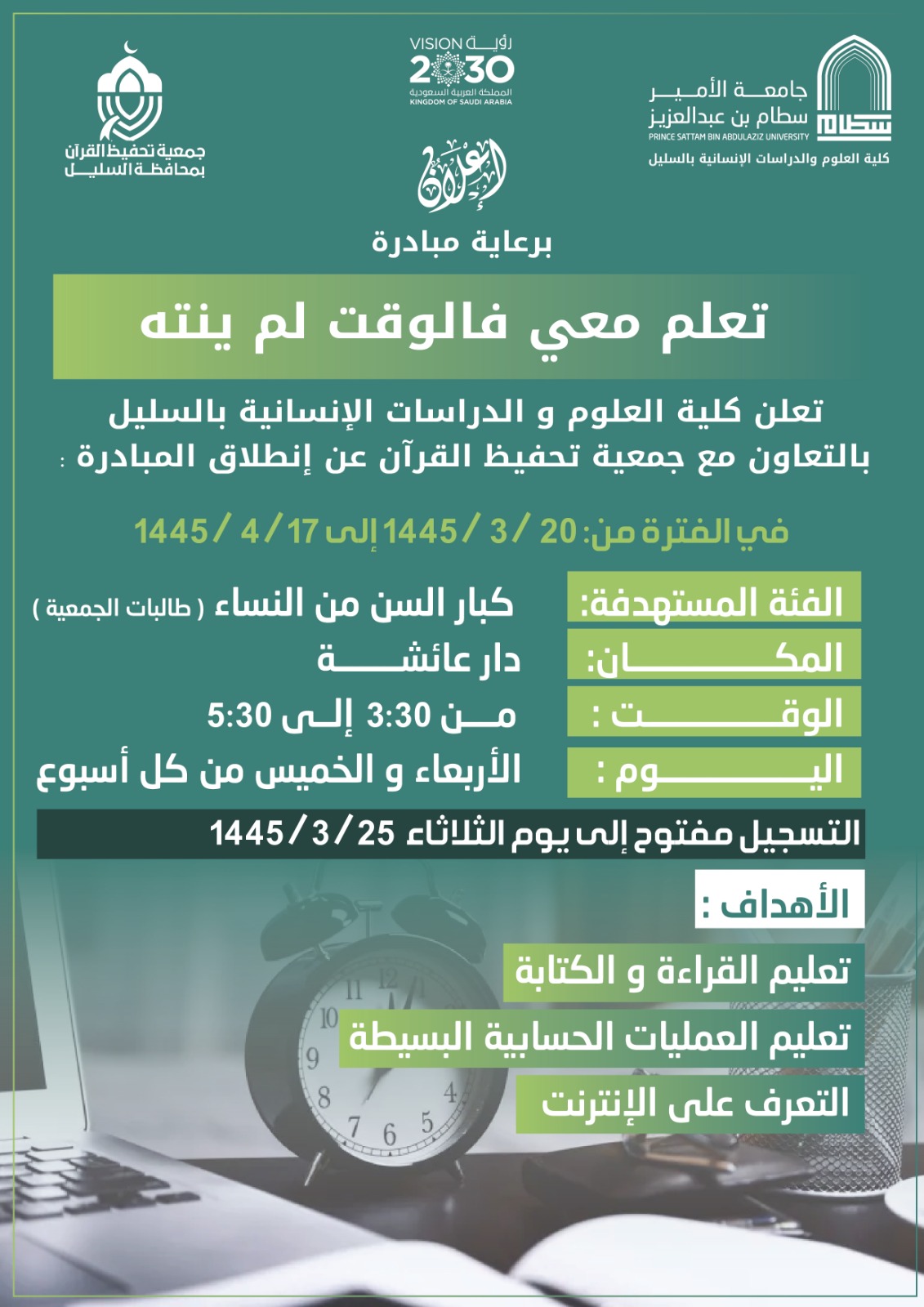 وتهدف المبادرة إلى تحسين مهارات القراءة والكتابة، والعمليات الحسابية، والمهارات الحاسوبية الأولية، والدورة موجهة إلى طالبات الجمعية، حيث تأتي المبادرة بالشراكة بين الكلية وجمعية تحفيظ القرآن الكريم بالسليل، وتقام الدورة في دار عائشة لتحفيظ القرآن بالسليل، علما بأن التسجيل مفتوح إلى يوم الثلاثاء ٢٥ / ٣ / ١٤٤٥هـ.