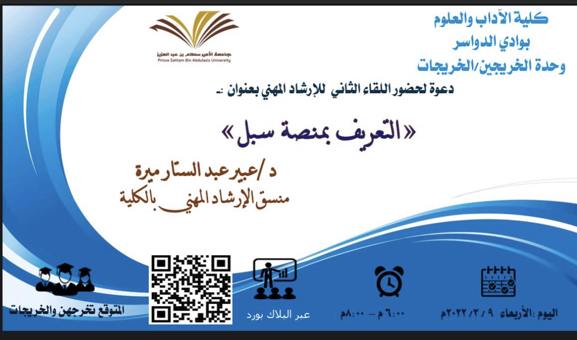 تعلن كلية الآداب والعلوم شطر الطالبات -بوادي الدواسر عن دعوة لحضور اللقاء الثانى للإرشاد المهنى بعنوان "التعريف بمنصة سبل "