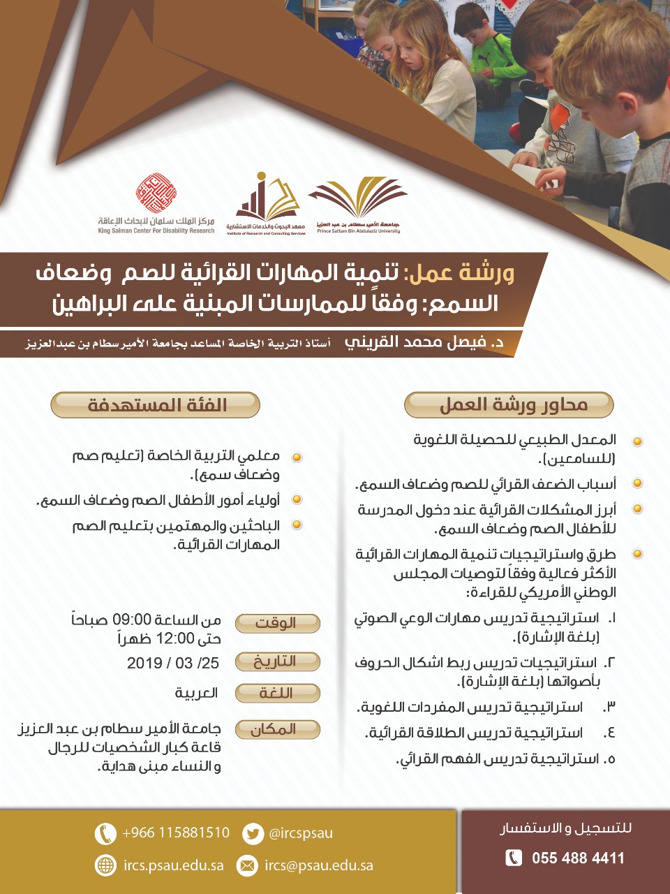 يقدمها الدكتور فيصل بن محمد القريني أستاذ التربية الخاصّة المساعد بالجامعة، ووكيل المعهد للبرامج والبحوث والدراسات، وذلك يوم الاثنين 25/3/2019م، من الساعة التاسعة صباحًا وحتى الثانية عشرة ظهرًا، بقاعة كبار الشخصيات للرجال، ومبنى الهداية للنساء، وتهدف الورشة إلى: