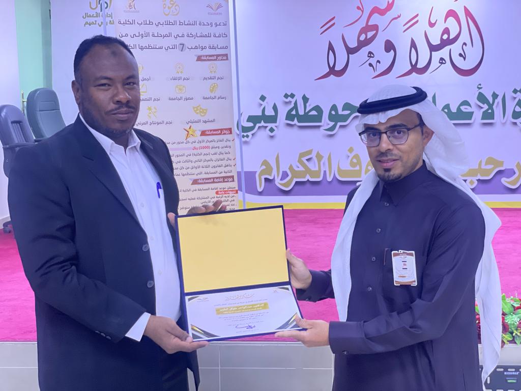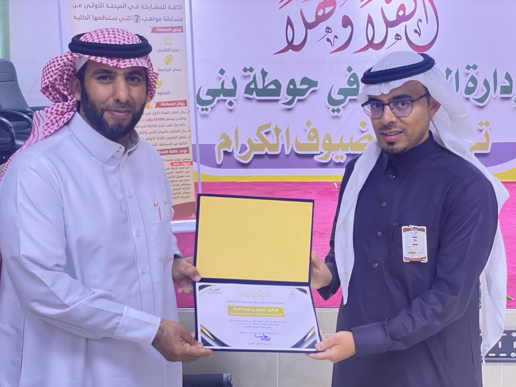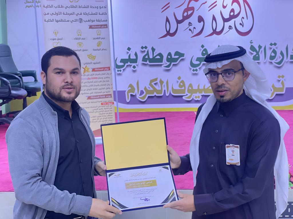 وفي ختام المسابقة شكر عميد الكلية المكلّف د. بدر التميمي أعضاء لجنة التحكيم، مُقدّمًا لهم شهادات شكر وتقدير.