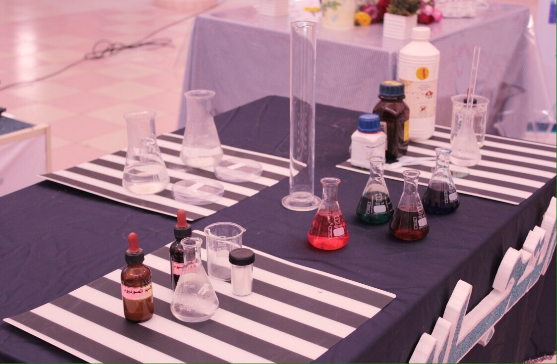 - التجارب الكيميائية .. قامت الطالبات بعمل تجارب عمليه أمام الحضور.
