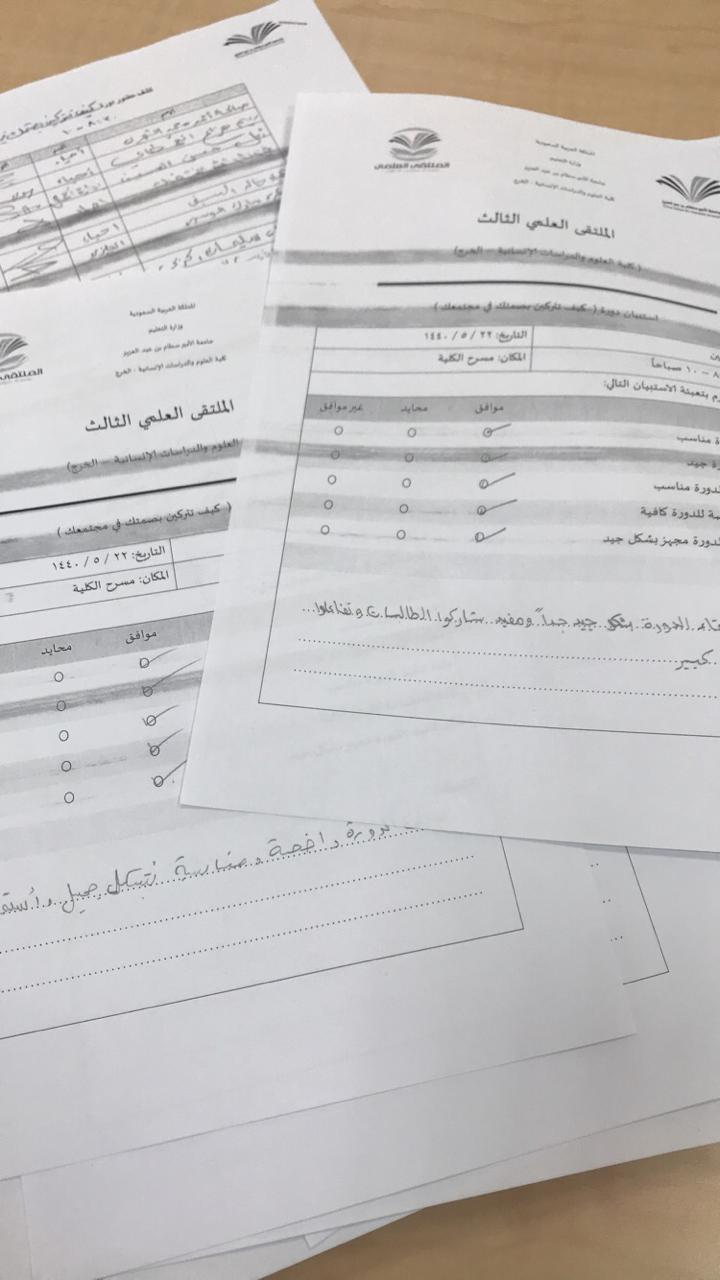 نظمت اللجنة التنسيقية للملتقى العلمي الثالث بالكلية لمدة ثلاث أيام على التوالي ابتداء من يوم الأحد الموافق 21/5/1440هـ دورات تدريبية لتدريب الطالبات المشاركات في الملتقى وهي: