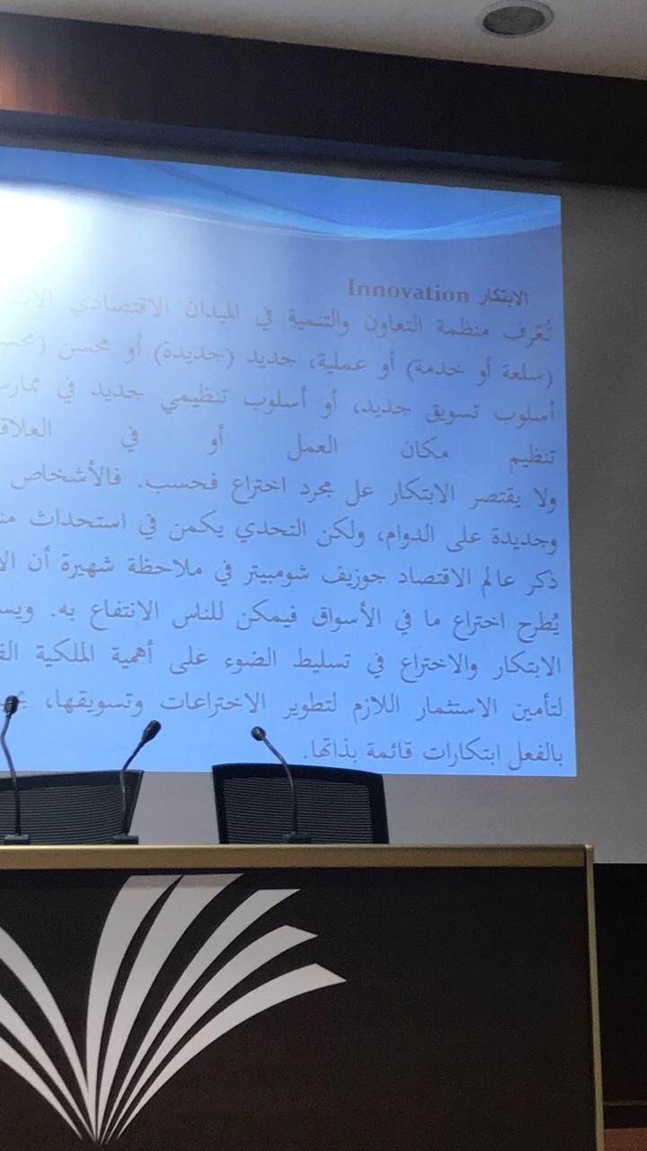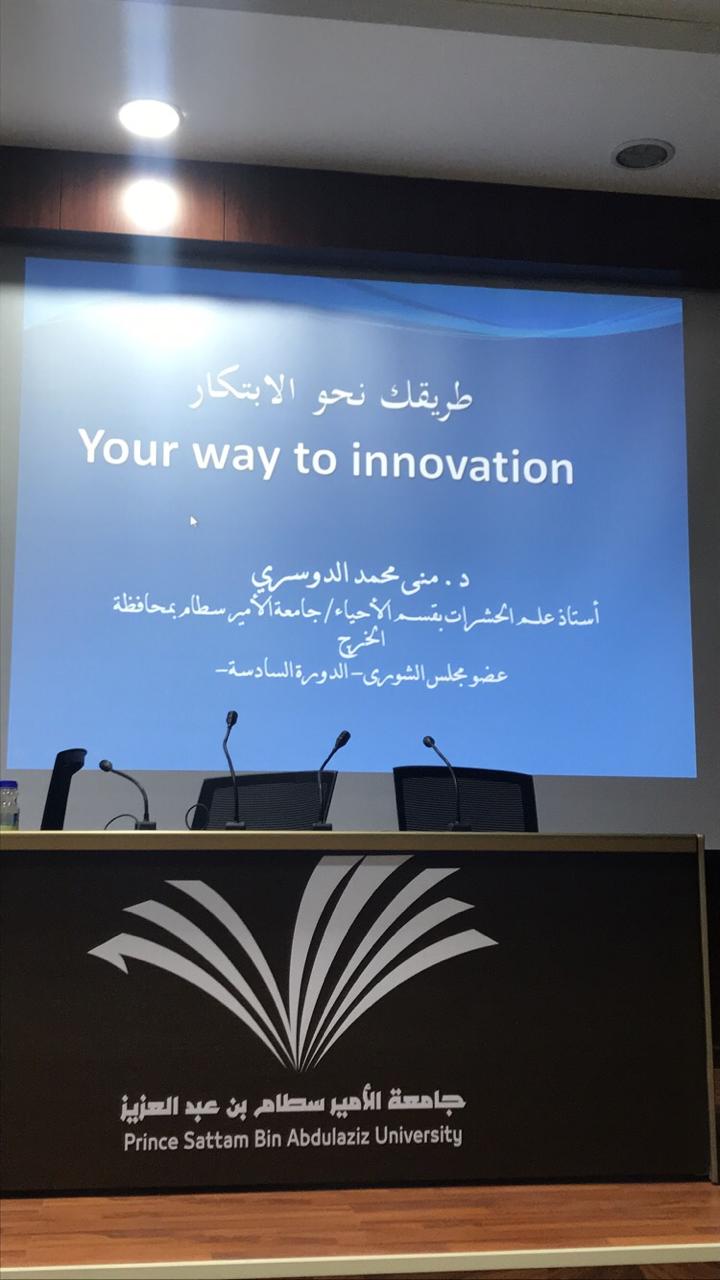 - وكان في يوم الثلاثاء 23/5/1440هـ تشجيعًا للطالبات للمشاركة في محور الابتكارات والاختراعات تم عقد دورة تدريبية بعنوان (طريقك نحو الابتكار) قدمتها الدكتورة منى الدوسري وضحت فيها معنى الابتكار والاختراع والفرق بينهما وأنواع الابتكار وشروطه كما ذكرت أيضًا معنى براءة الاختراع وكيفية تسجيله.