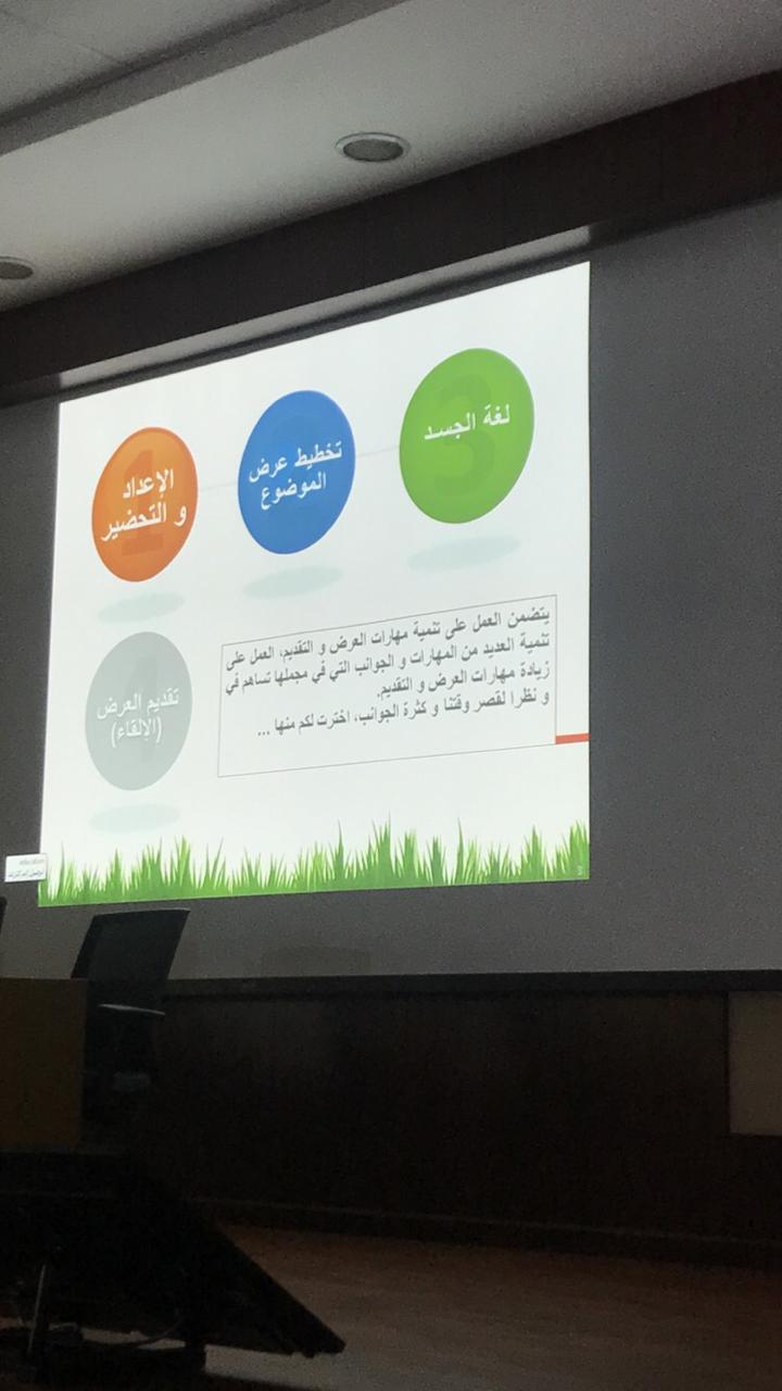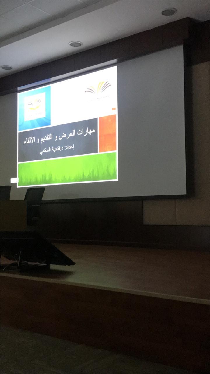 - ففي يوم الأحد 21/5/1440هـ كان هناك دورة تدريبية بعنوان (مهارات العرض والتقديم والإلقاء) من تقديم الدكتورة فتحية حكمي حيث كان الهدف منها تأهيل الطالبات وتدريبهم على طريقة عرض مشاركاتهم وذكرت أن هناك العديد من الجوانب والمهارات تنميتها تسهم في تنمية مهارات العرض والتقديم وختامًا قامت الطالبات بتقييم الدورة من خلال الاستبيان المعد لذلك واتضح منه مدى الاستفادة من الدورة.