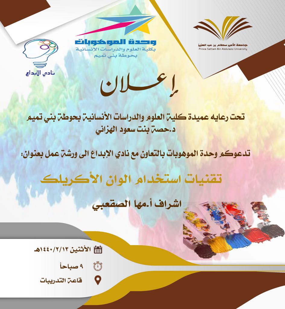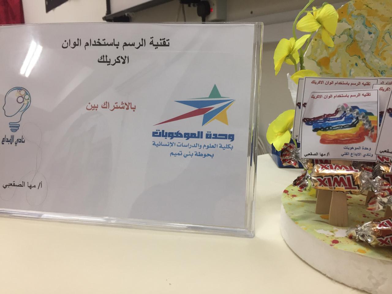 يُعد الرسم بالألوان المائية ممتعًا في بعض الأوقات ومحبطًا في أوقات أخرى؛ حيث أنها مهارة تعتمد على الطريقة التي تمارس بها الرسم، حيث يمكنك أن ترسم بطريقة دقيقة ومحددة جدًا، كما بإمكانك الرسم بطريقة ناعمة وانطباعية دون تحديد. سعياً لتعليم أساسيات الرسم والتلوين واتقان هذه المهارة مع دمج الظلال واختيار الإضاءة المناسبة، نفذت وحدة الموهوبات بالتعاون مع نادي الإبداع الفني بكلية العلوم والدراسات الإنسانية بحوطة بني تميم ورشة عمل بعنوان" تقنيات استخدام ألوان الأكريلك " وذلك يوم الاثنين الموافق 13 / 2 / 1440 هـ بإشراف الأستاذة مها الصقعبي. هدفت الدورة إلى تعزيز فهم وتطبيق تقنية الرسم باستخدام ألوان الأكريلك و بدأت بإعطاء نبذه بسيطة عن ألوان الاكريلك وطرق استخدامها بالإضافة إلى الأدوات والخامات المستخدم المناسبة لهذه التقنية. كما قامت الأستاذة بشرح تطبيقي أمام الطالبات توضح فيه طريقة التلوين. بعد انتهاء شرح الأستاذة، قام عدد من الطالبات بتطبيق التقنية وانتاج لوحات فنيه وقد شهدت هذه الفعالية حضور فعالاً ومميزاً من قبل عدد من الطالبات.