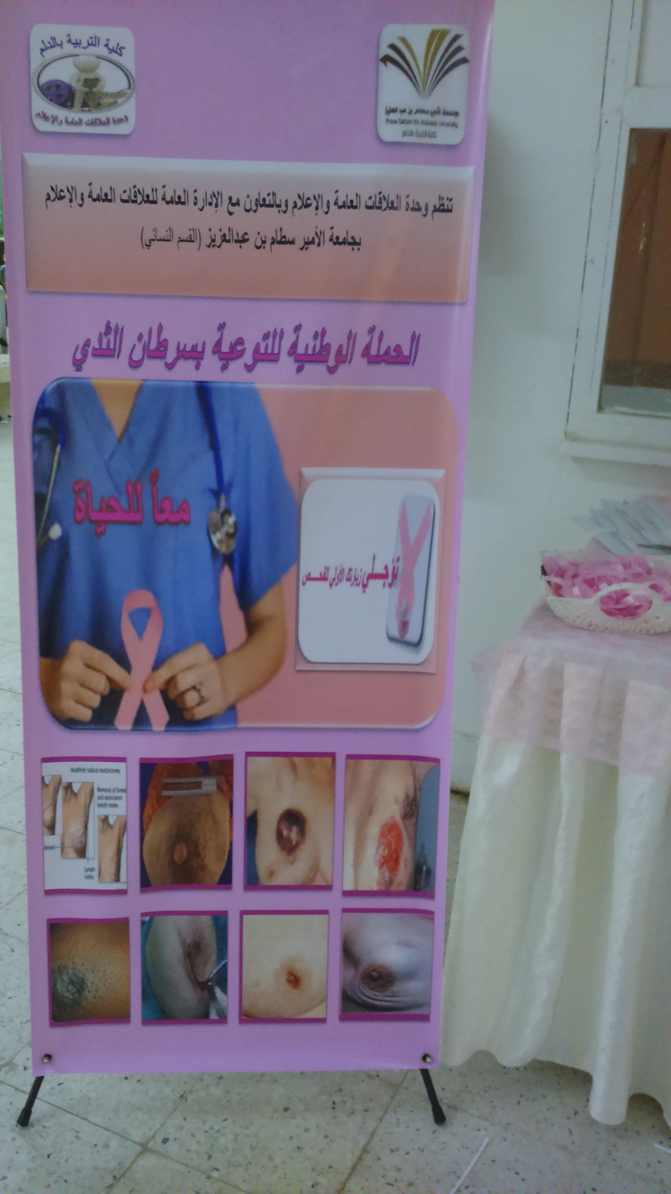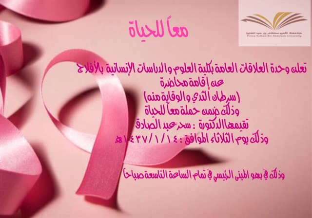 يسر إدارة العلاقات العامة والإعلام أن تقدم لكم تقريرًا مصورًا عن حملة (معًا للحياة) لمكافحة سرطان الثدي ببرامجها المختلفة في جميع كليات البنات.