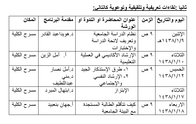 direction:rtl;unicode-bidi:embed">ويستكمل البرنامج فعالياته يومي الثلاثاء والأربعاء 17-18 /1/1438هـ بمحاضرتين الأولى بعنوان (الابتزاز) تقديم د. ابتهال المبرد، والثانية بعنوان: (كيف تتأقلم الطالبة المستجدة مع البيئة الجامعية) تقديم أ. جيهان عبيد .