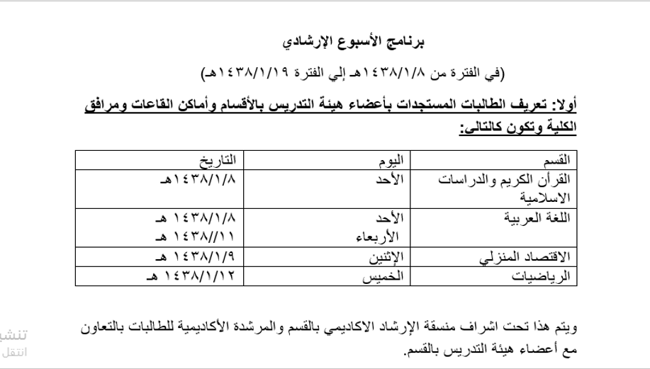 direction:rtl;unicode-bidi:embed">نظمت وحدة الإرشاد الأكاديمي بكلية التربية للبنات بالدلم برنامج الأسبوع الإرشادي للطالبات المستجدات، والذي بدأ يوم 8 /1/1438هـ، ويستمر لمدة أسبوعين حيث ينتهي يوم 19/1/1438هـ ، برعاية عميدة الكلية الدكتور مليحة القحطاني، وإشراف الدكتورة هويدا عبدالقادر مشرفة وحدة الإرشاد؛ ويهدف البرنامج إلى تهيئة وتعريف المستجدات بالأنظمة واللوائح الخاصة بالجامعة ، بالإضافة إلى تعريفهن بأعضاء هيئة التدريس بالأقسام، والقاعات الدراسية، ومرافق الكلية المختلفة.