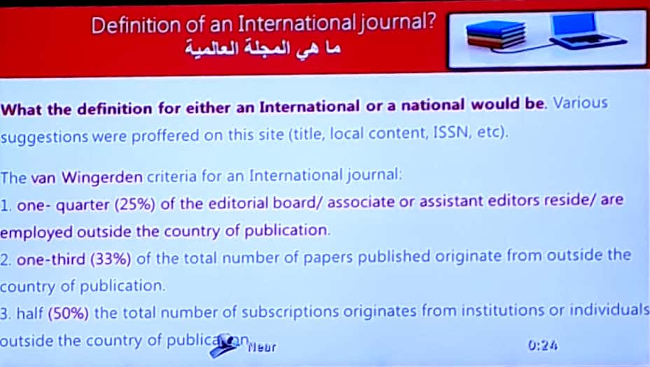 - قدم المحاضرة الاستاذ الدكتور/عبدالمنعم سليمان الأستاذ بكلية العلوم الطبية التطبيقية ، واشتملت الورشة على عدة محاور كان من أهمها التعريف بمصطلح المجلات العالمية وماهي المميزات والفوائد التي تعود على الباحث من خلال النشر في اوعية النشر المتميزة وأسس ومراحل التصنيف في قاعدتي شبكة العلوم (WOS-ISI) (Scopus) كما تناول المحاضر أيضا شروط التصيف في قواعد البيانات العالمية،أسس اختيار موضوعات البحوث التي يمكن ان تنشر في المجلات العلمية مهارات تكوين الفريق البحثي، طرق كتابة ومراحل إعداد الاوراق العلمية، مراحل تحكيم البحوث وطرق التواصل الفعال مع المحررين والمحكمين, أسباب رفض الاوراق العلمية ،مهارات النشر العلمي في المجلات ذات معامل الانتشار المرتفع، الأخطاء الشائعة في النشر العلمي ،الاستعداد لمرحلة ما بعد النشر العلمي كما تناول أيضاً أمثلة عن طرق الصياغة العلمية المطلوبة للمجلات ذات معامل التأثير المرتفع.