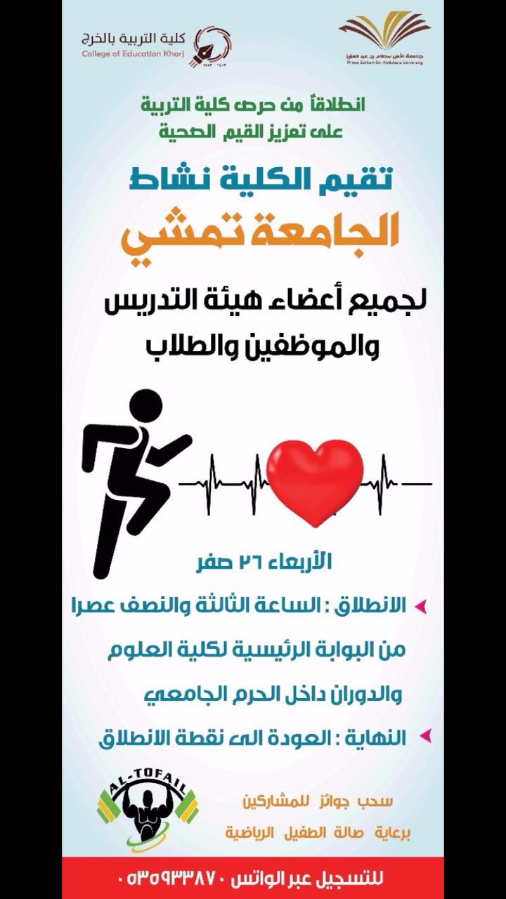انطلاقًا من حرص كلية التربية بالخرج على تعزيز القيم الصحيّة، تقيم الكلية نشاطًا صحيًّا بعنوان (الجامعة تمشي) لمنسوبي الجامعة (أعضاء هيئة التدريس - والموظفون - والطلاب) اليوم الأربعاء 26 / 2 / 1439هـ ، وسيكون الانطلاق الساعة الثالثة والنصف عصرًا من البوابة الرئيسية لكلية العلوم والدوران خلف الحرم الجامعي ثم العودة إلى نقطة الانطلاق.