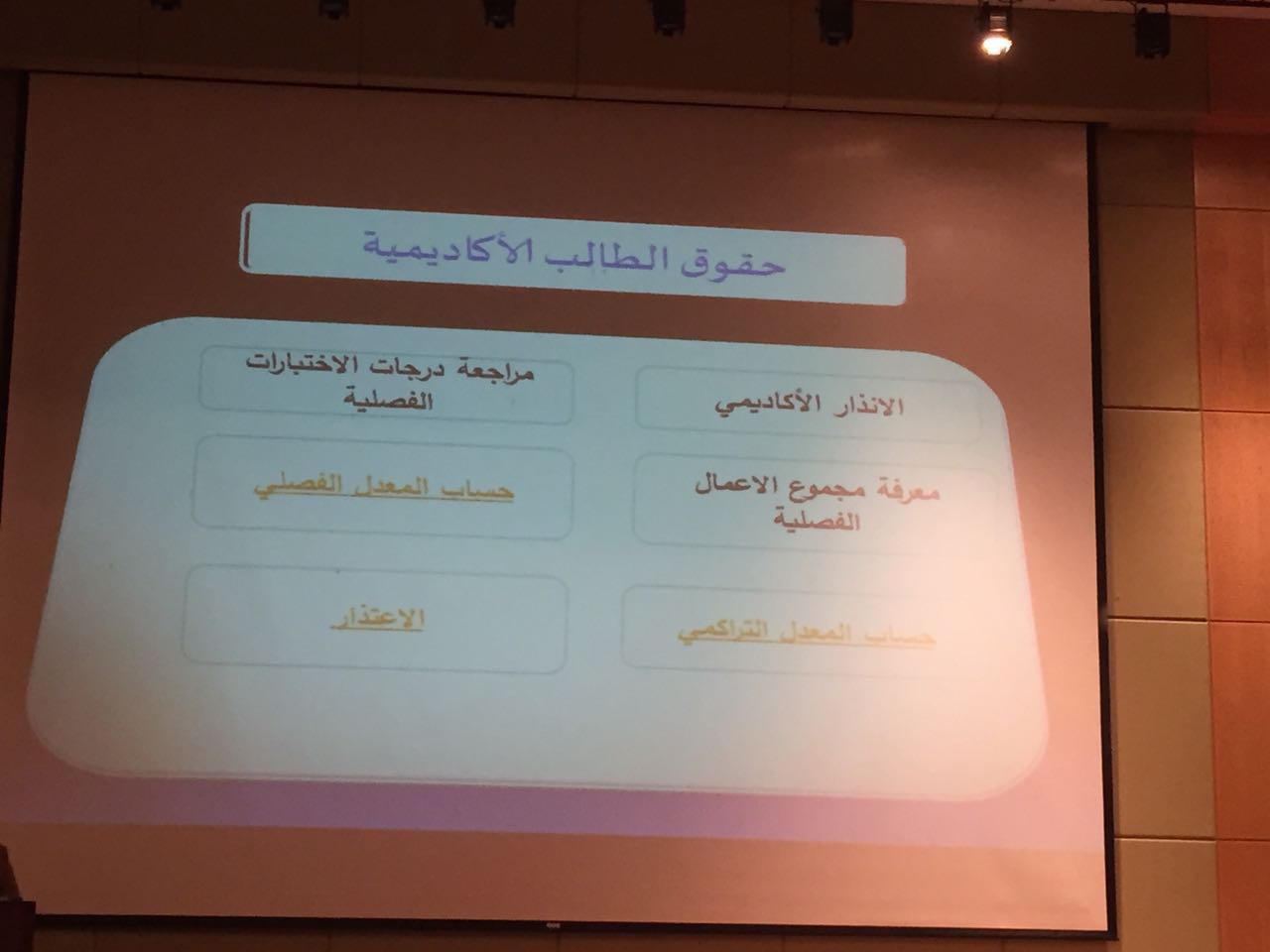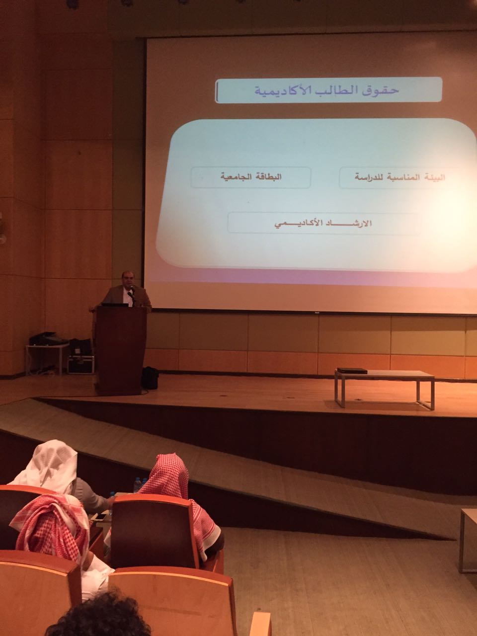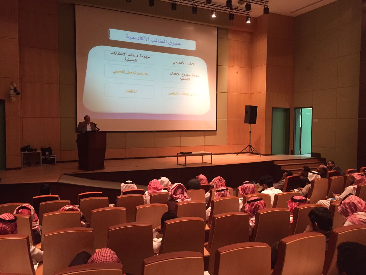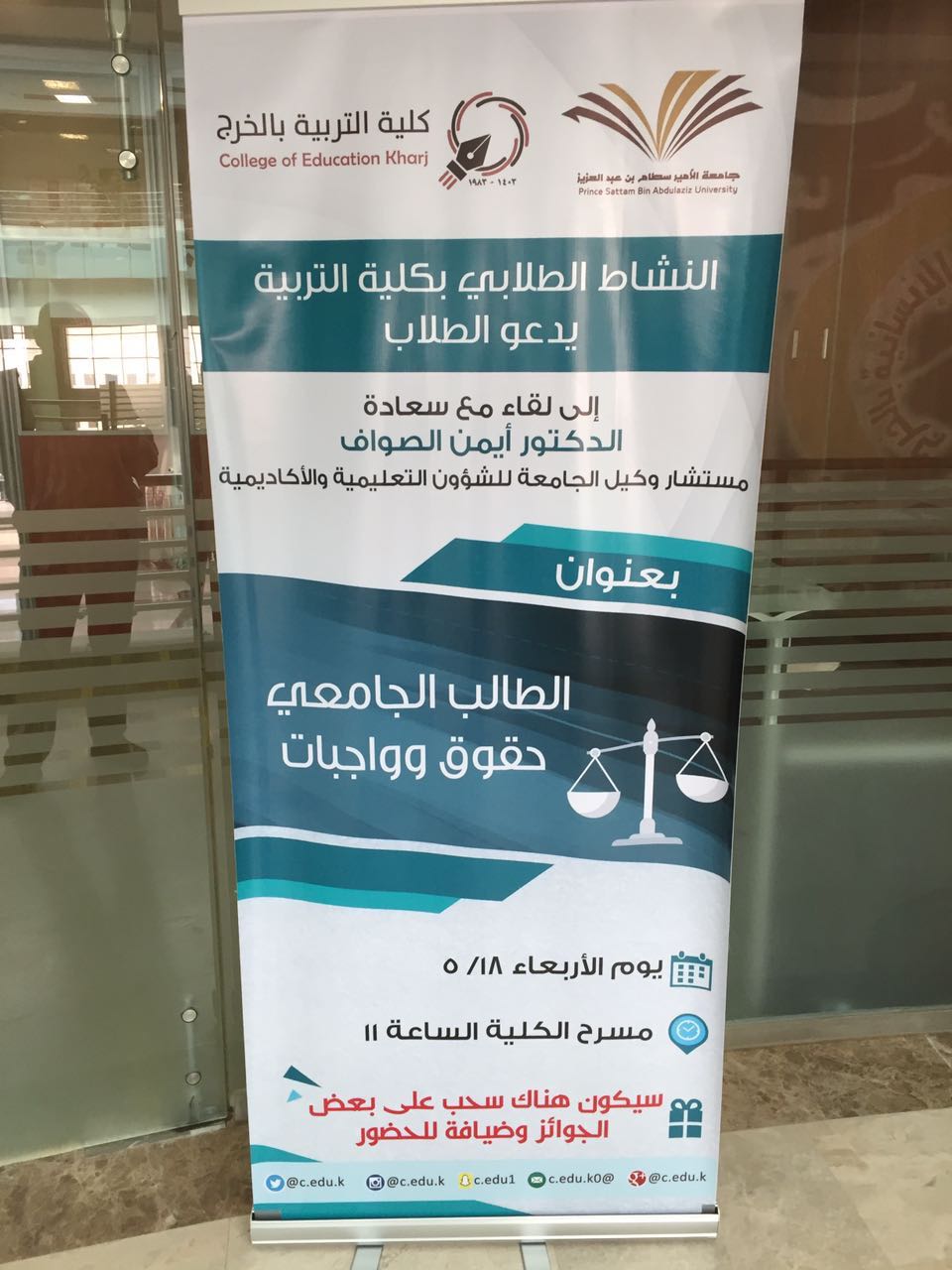 نظّم النشاط الطلابي بكلية التربية بالخرج لقاءً تعريفيًّا لطلاب الكلية مع الدكتور أيمن الصوّاف مستشار وكيل الجامعة للشؤون التعليمية والأكاديمية، بعنوان (الطالب الجامعي حقوقه .. وواجباته) في مسرح الكلية ظهر الأربعاء 18 / 5 / 1438هـ برعاية عميد الكلية الدكتور عبد الرحمن الرفدي.