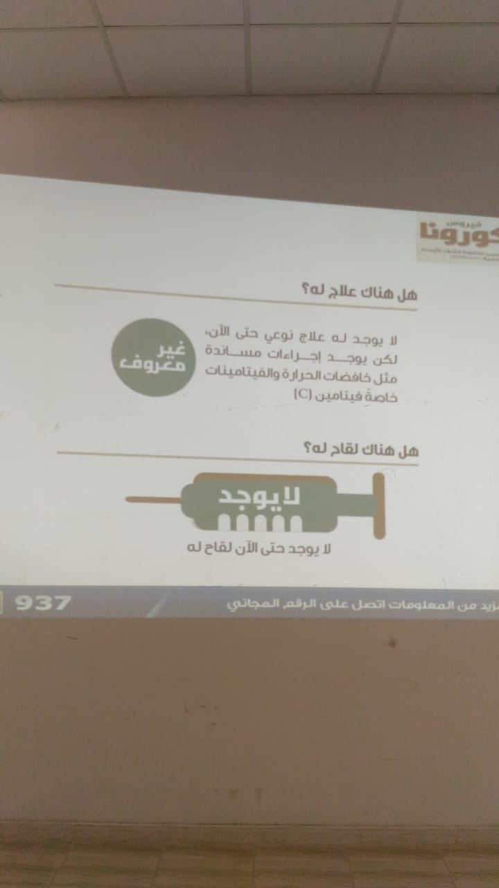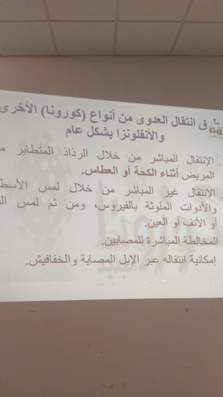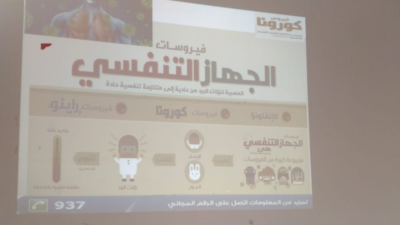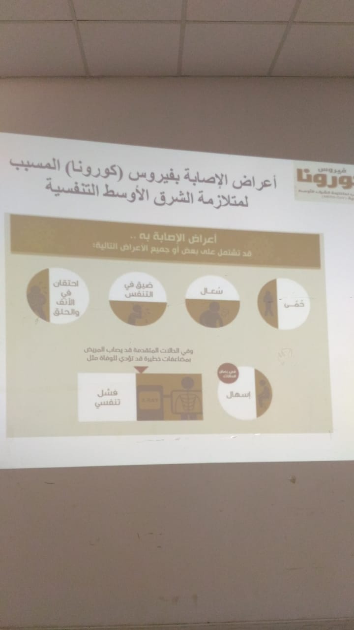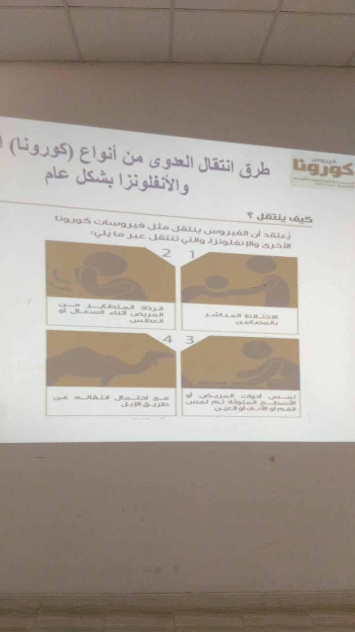 نظمت وحدة العمل الطلابى وخدمة المجتمع بكلية العلوم الطبية وادى الدواسر محاضرة توعوية بعنوان "طرق الوقاية من فيروس كورونا الشرق الأوسط" قدمتها أ. زينب آدم أستاذ الكيمياء الحيوية بقسم المختبرات الطبية تكلمت عن أعراض الإصابة بالمرض وكيفية إنتقال العدوى وكيفية التعامل مع المرض عند الإصابة به بالإضافة الى الطرق المختلفة للوقاية من الفيروس كما تم توزيع مطويات توعوية للحضور وقد حضر الفعالية عدد كبير من منسوبات الكلية من أعضاء هيئة التدريس إداريات وطالبات.