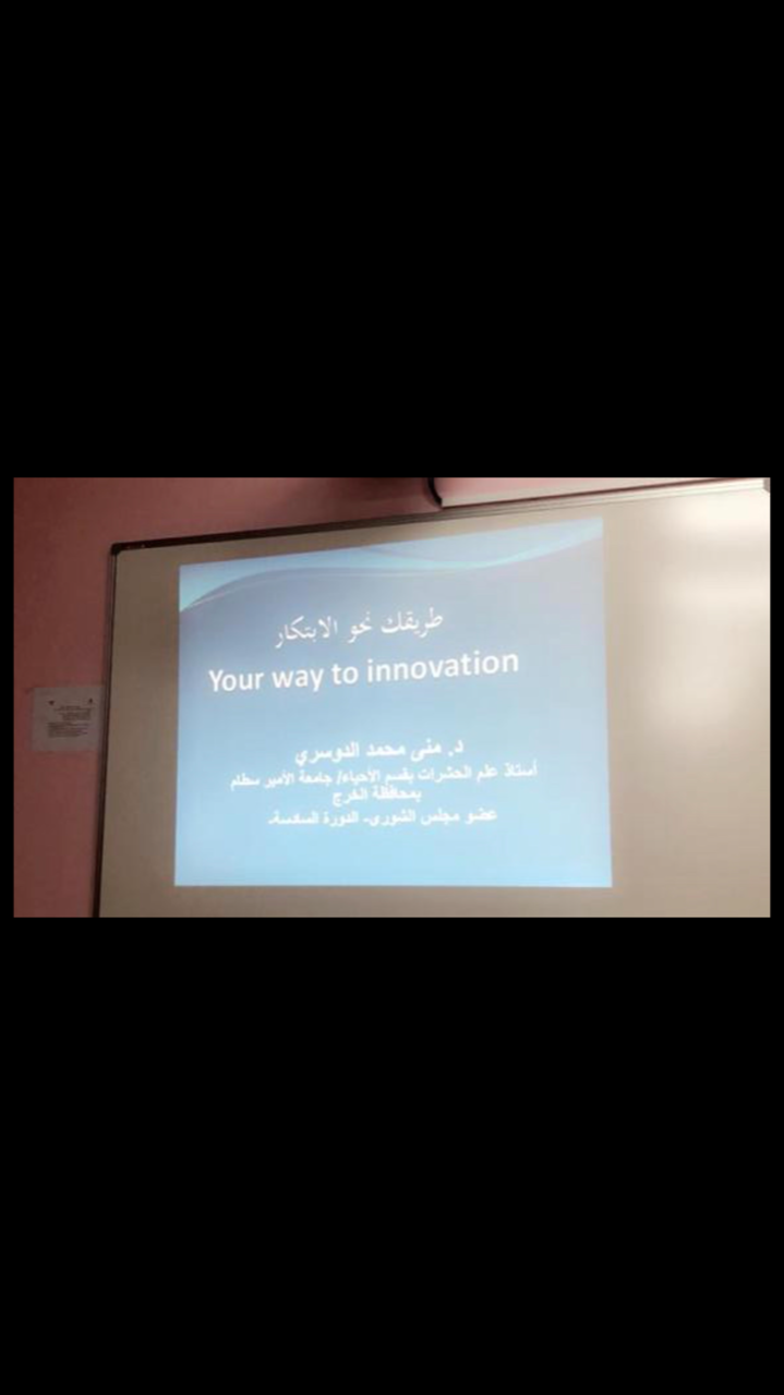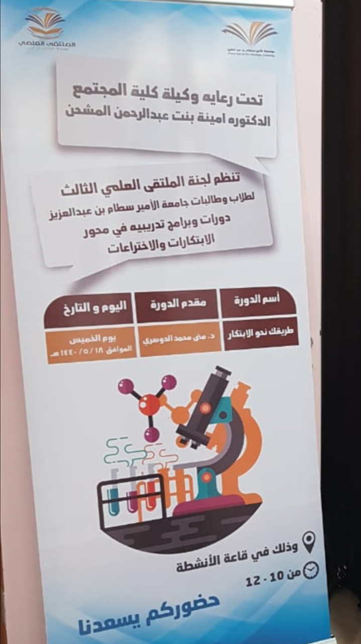 نظمت لجنة الملتقى العلمي الثالث بكلية المجتمع بالخرج -أقسام الطالبات – ضمن سلسلة الدورات التي تقيمها لطالباتها استعداداً للملتقى العلمي الثالث يوم الخميس الموافق ١٨/٥/ 1440هـ دورة تدريبية بعنوان "طريقك نحو الابتكار" من تقديم أ. د/ منى محمد الدوسري.