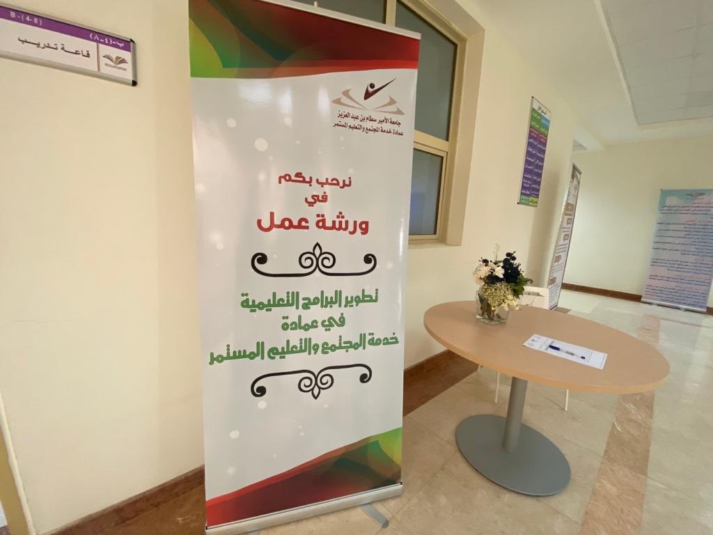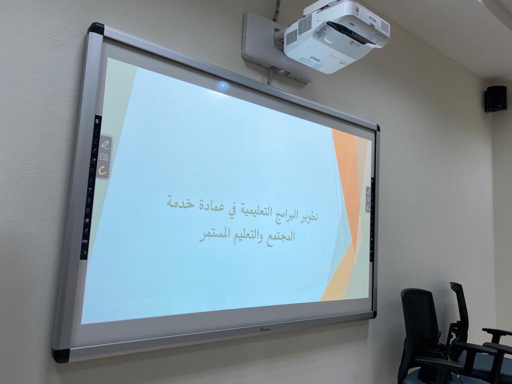 أقامت عمادة خدمة المجتمع والتعليم المستمر ورشة عمل بعنوان : تطوير البرامج التعليمية . بقيادة وكلاء العمادة الأستاذ الدكتورة نوف التميمي وكيلة القسم النسائي و وكيل العمادة الدكتور مشاري الحمادي .
