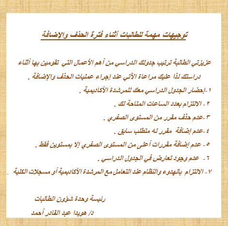 وجهت رئيسة وحدة شؤون الطالبات بكلية التربية بالدلم د/ هويدا عبد القادر . طالبات الكلية إلى عدة أمور مهمة خلال فترة الحذف الإضافة للفصل الدراسي الأول 1436 / 1437 هـ ونبهت الطالبات إلى أهمية ترتيب الجدول الدراسي لأنه يعد من أهم الأعمال التي تقوم بها الطالبة أثناء دراستها لذا عليها مراعاة الآتي عند إجراء عمليات الحذف والإضافة .